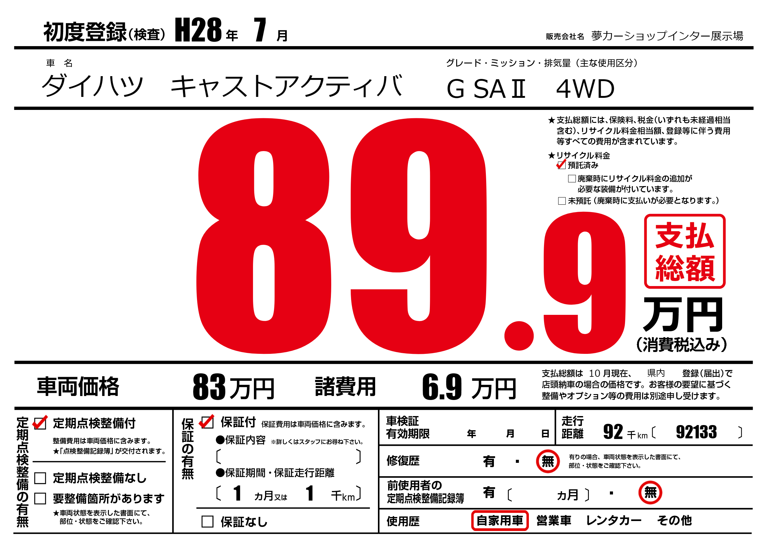 | 車名 | ダイハツ キャストアクティバ | グレード ミッション 排気量 |