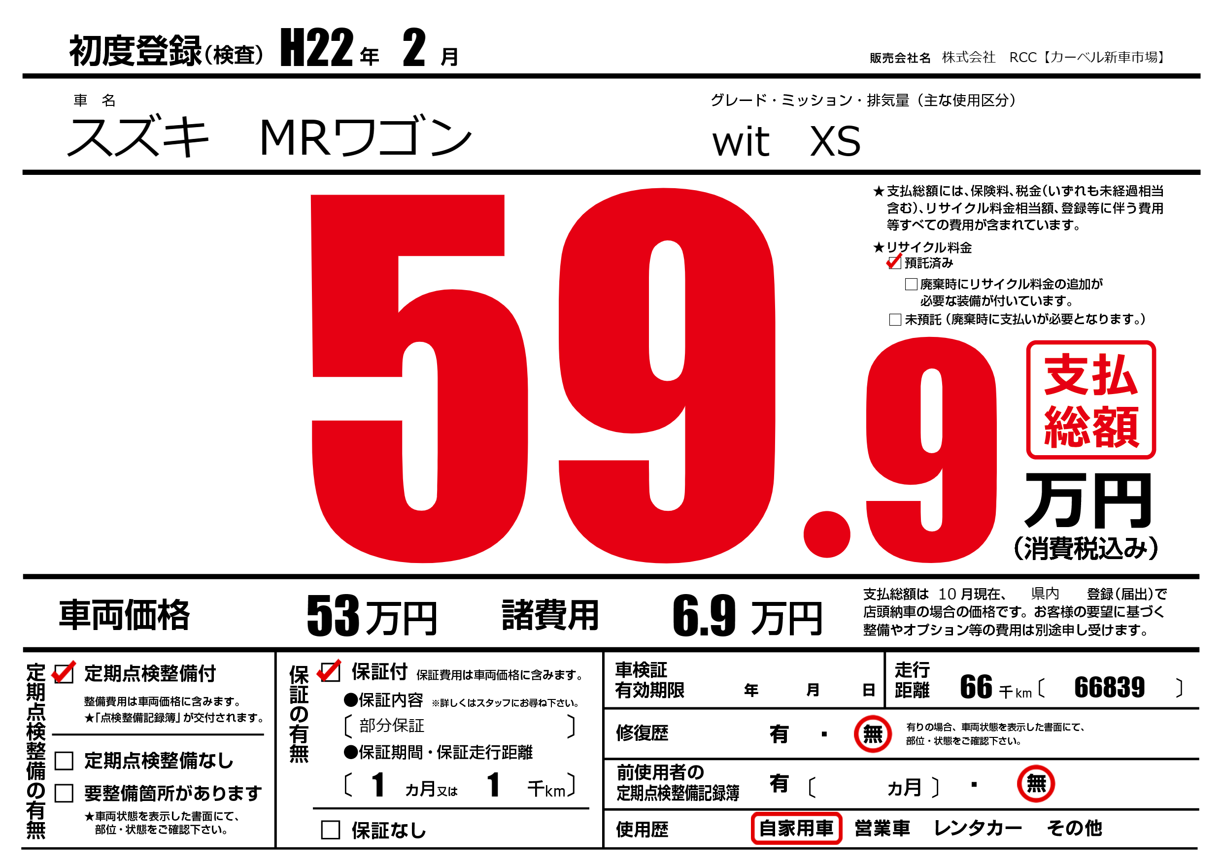 | 車名 | スズキ MRワゴン | グレード ミッション 排気量 |