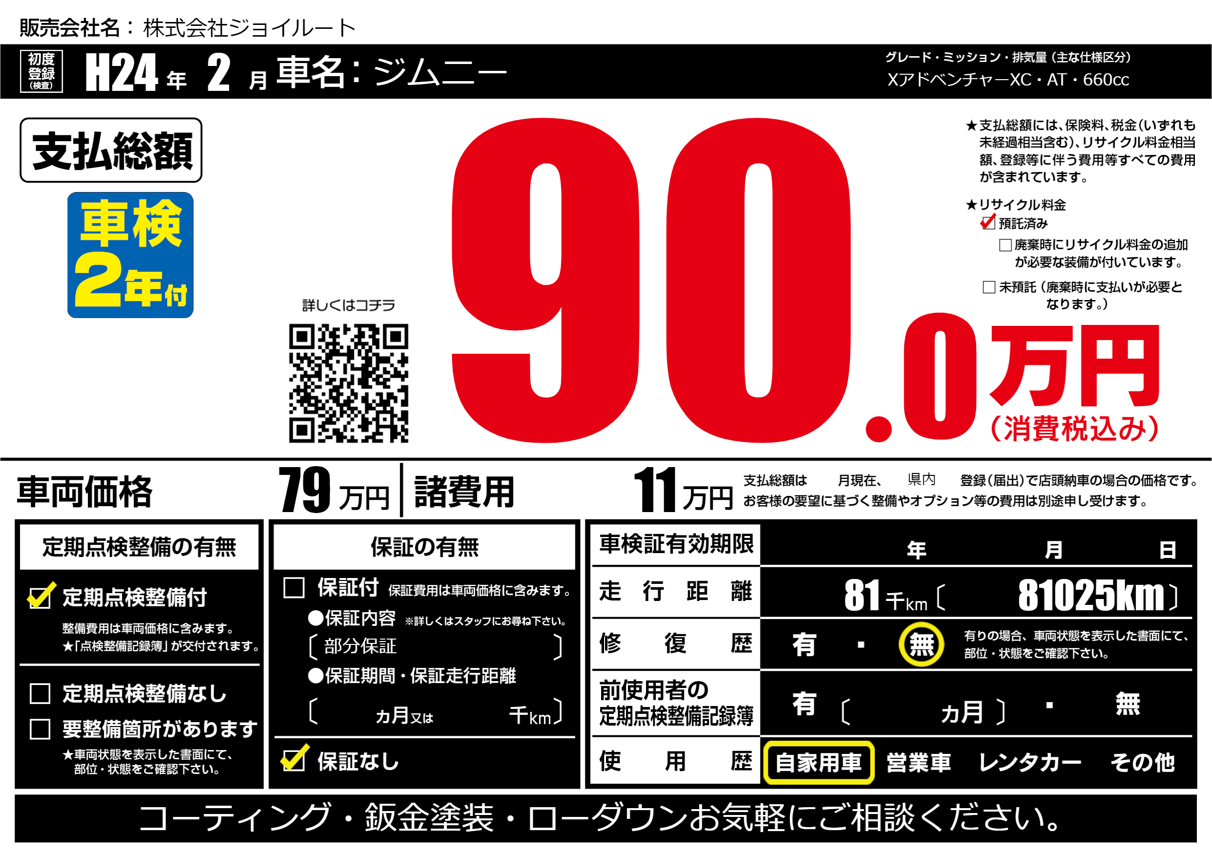 | 車名 | ジムニー | グレード ミッション 排気量 |