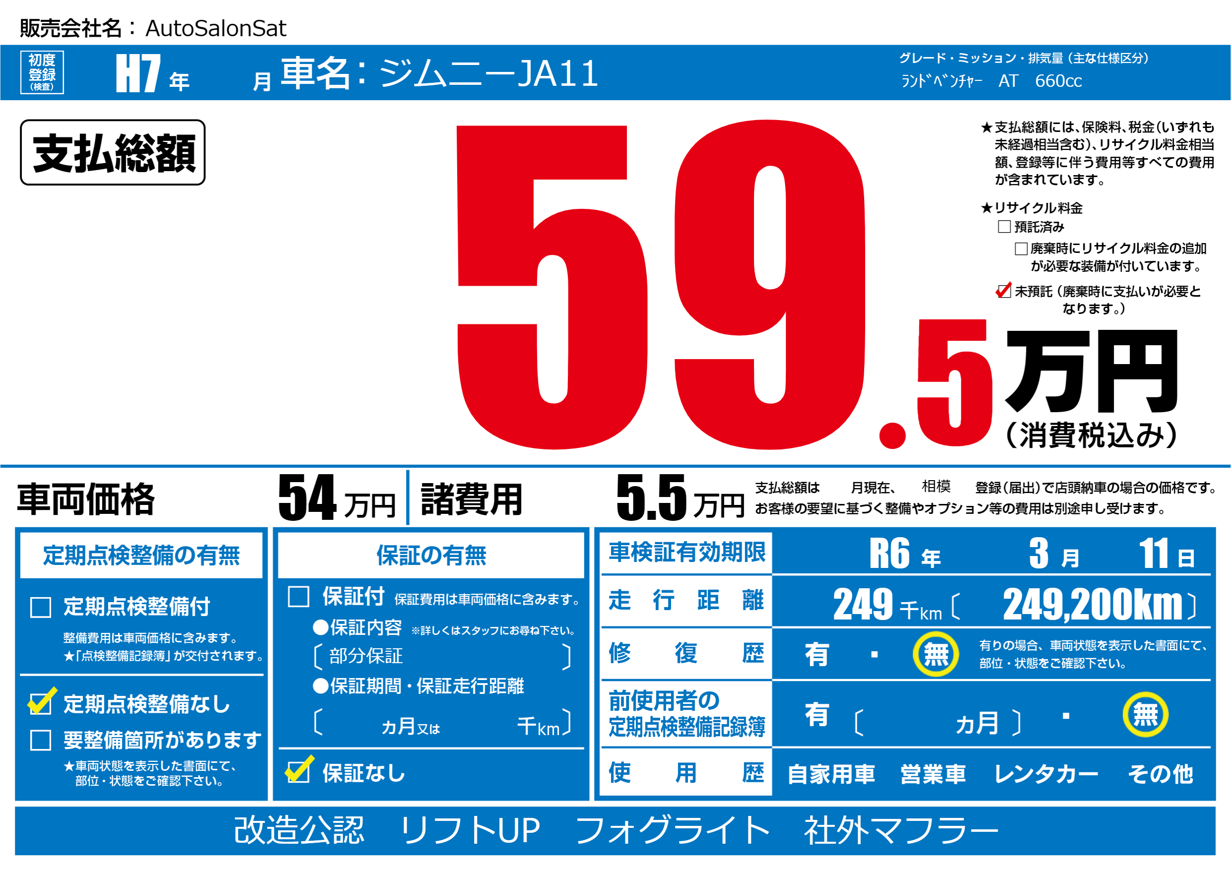 | 車検制限 | R6年 3月 11日 | ||