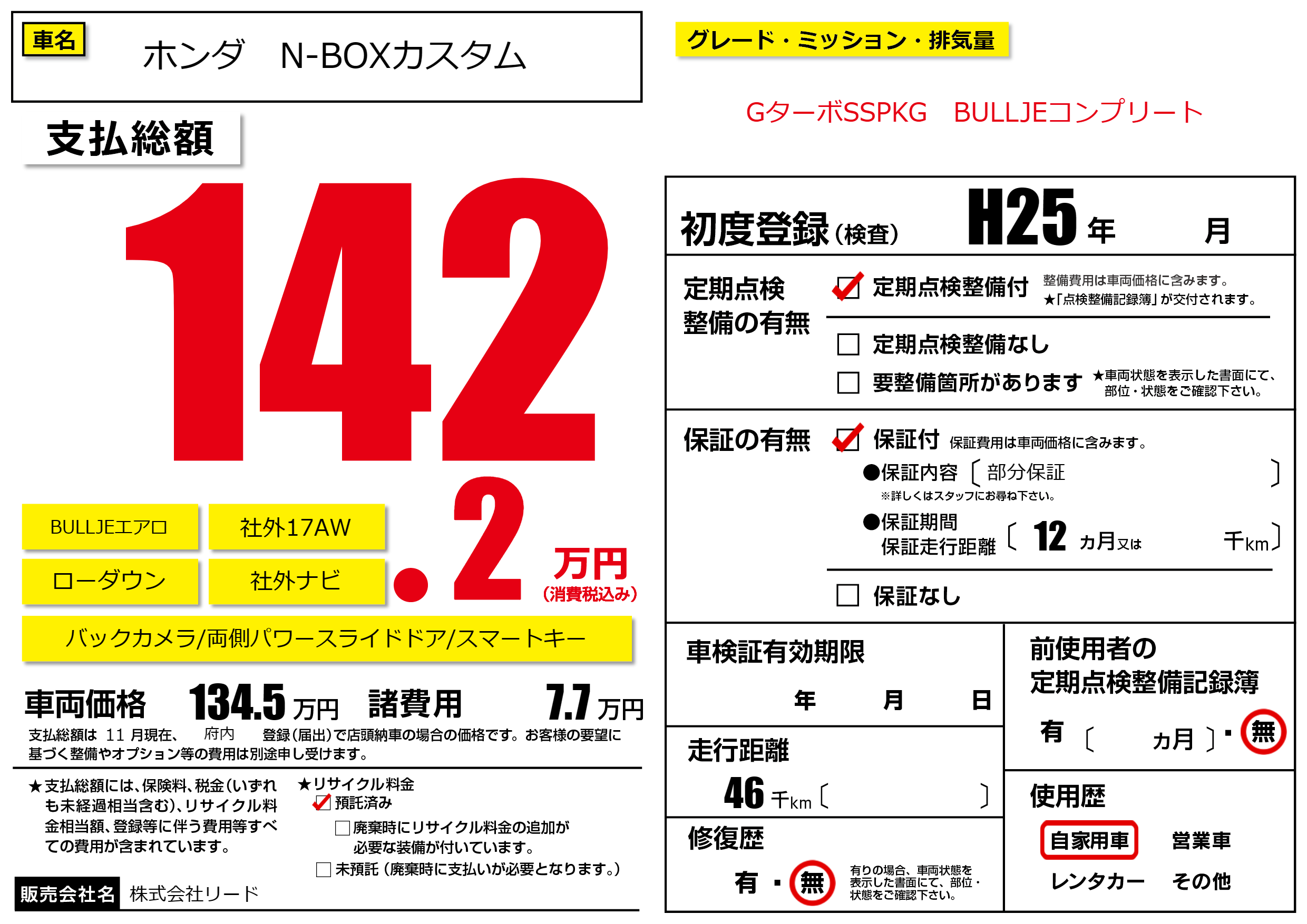 | 走行キロ | 4.6万km | 初年度登録 | H25年---月 |