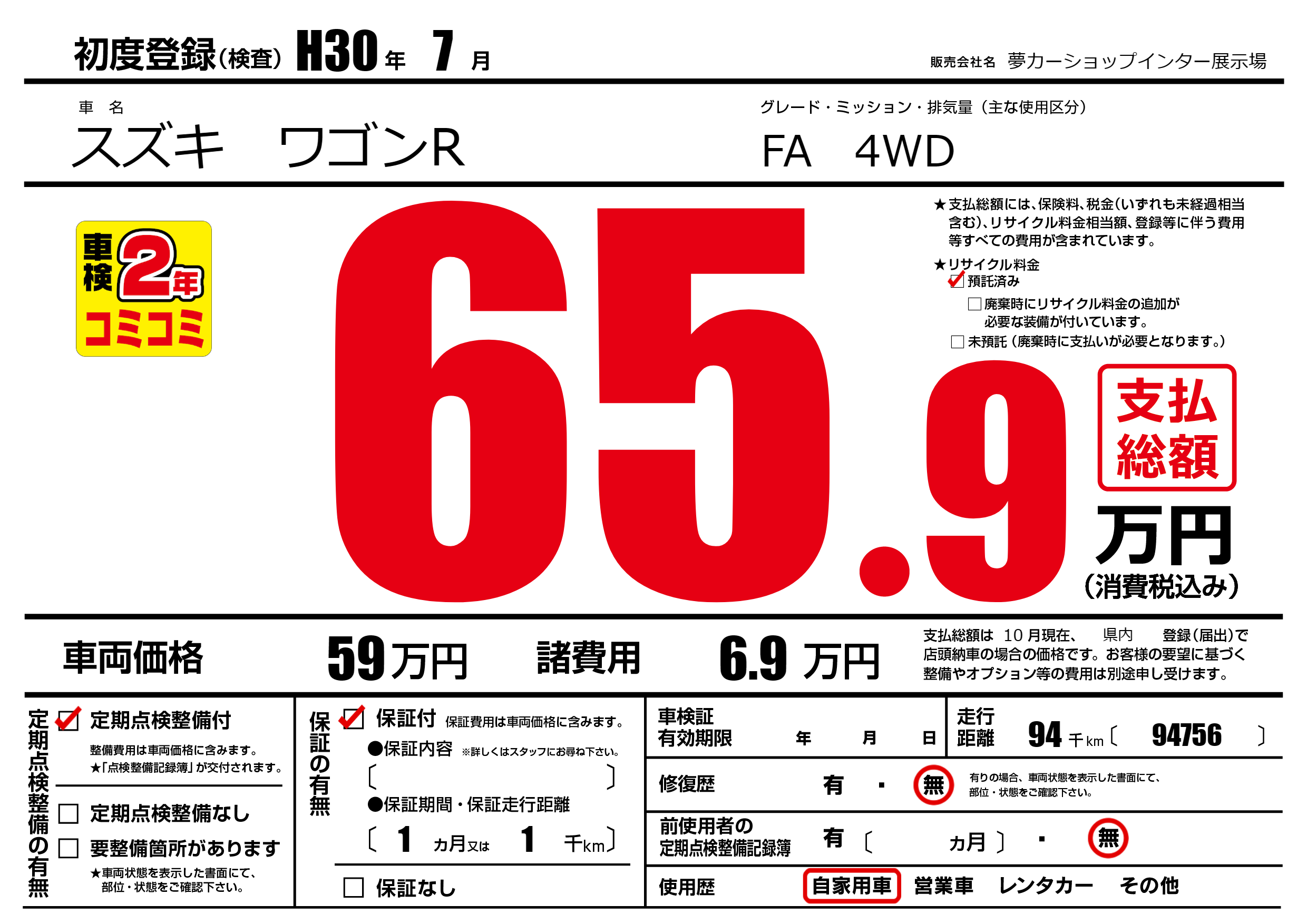 | 走行キロ | 9.4万km | 初年度登録 | H30年7月 |