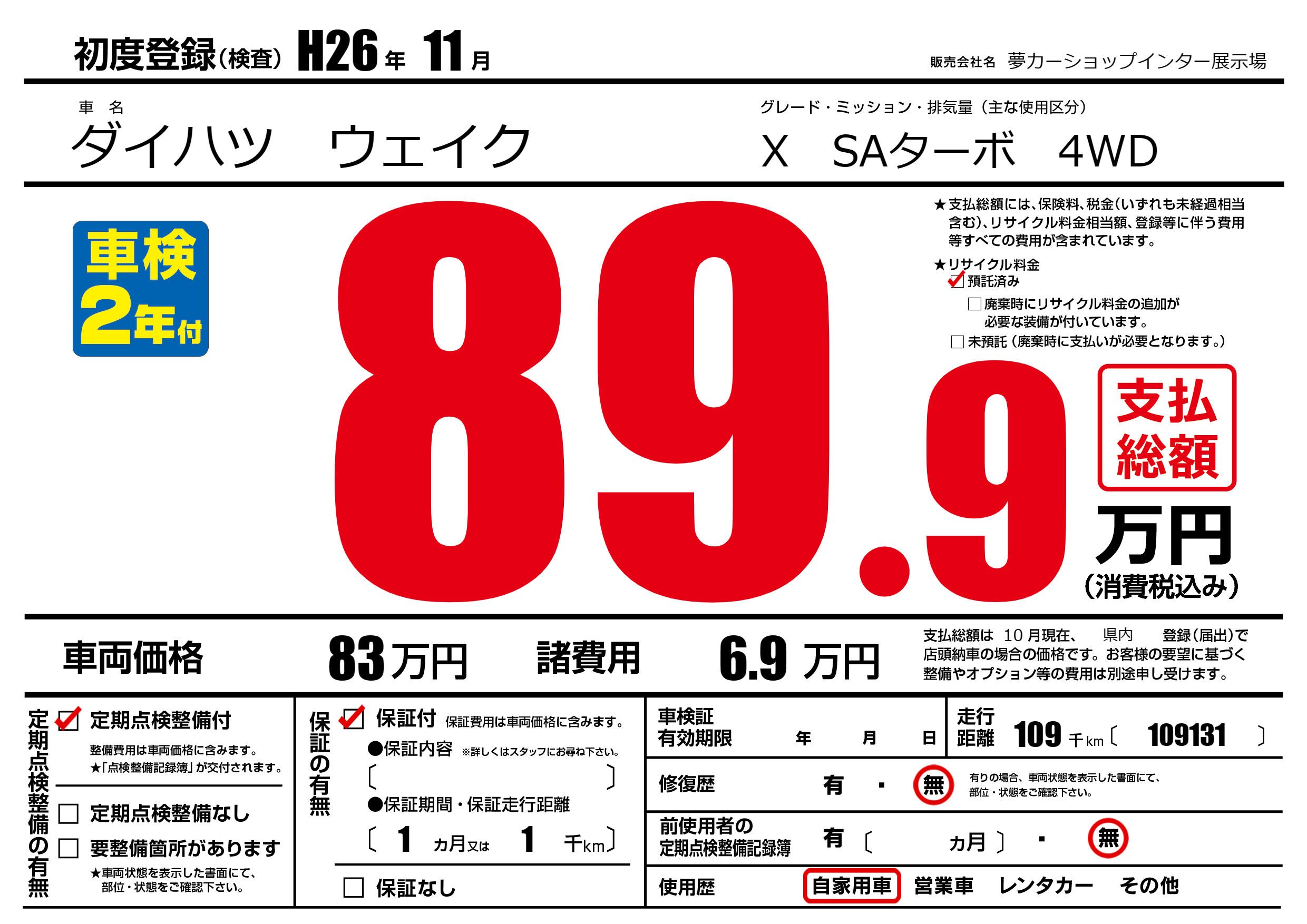 | 走行キロ | 10.9万km | 初年度登録 | H26年11月 |