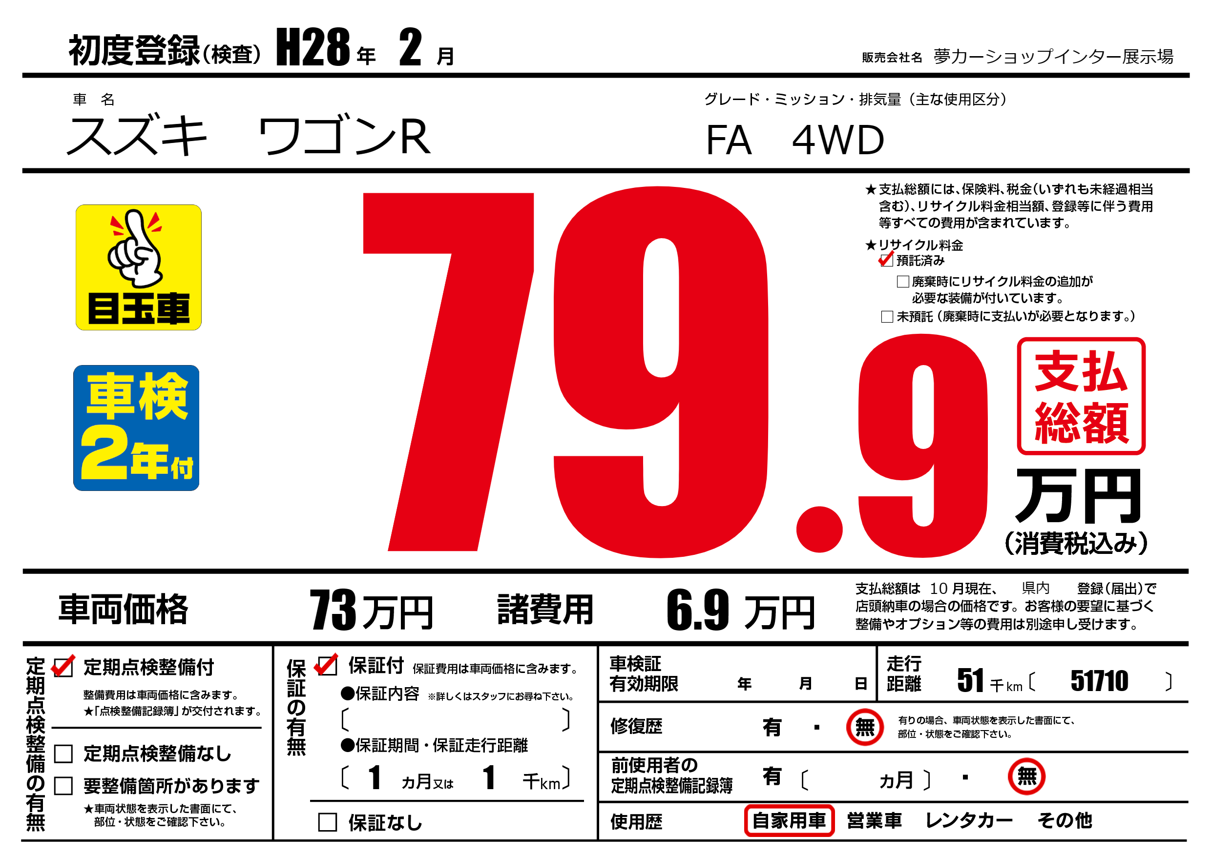 | 走行キロ | 5.1万km | 初年度登録 | H28年2月 |