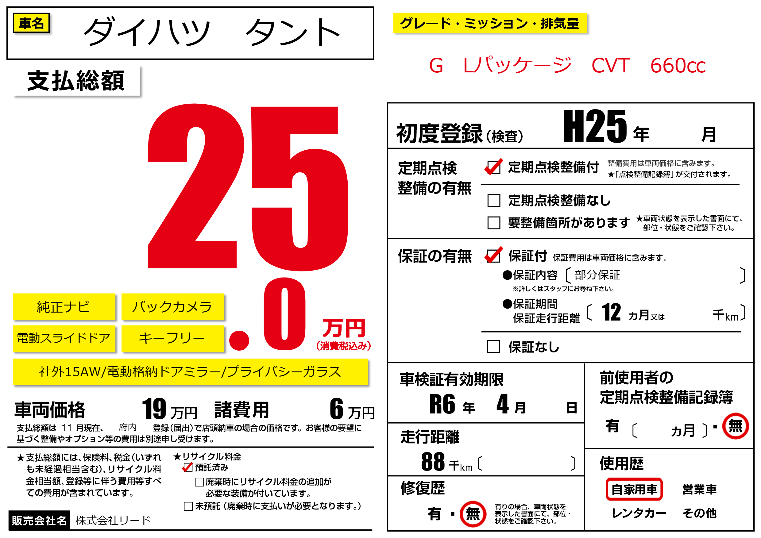 | 車名 | ダイハツ タント | グレード ミッション 排気量 |