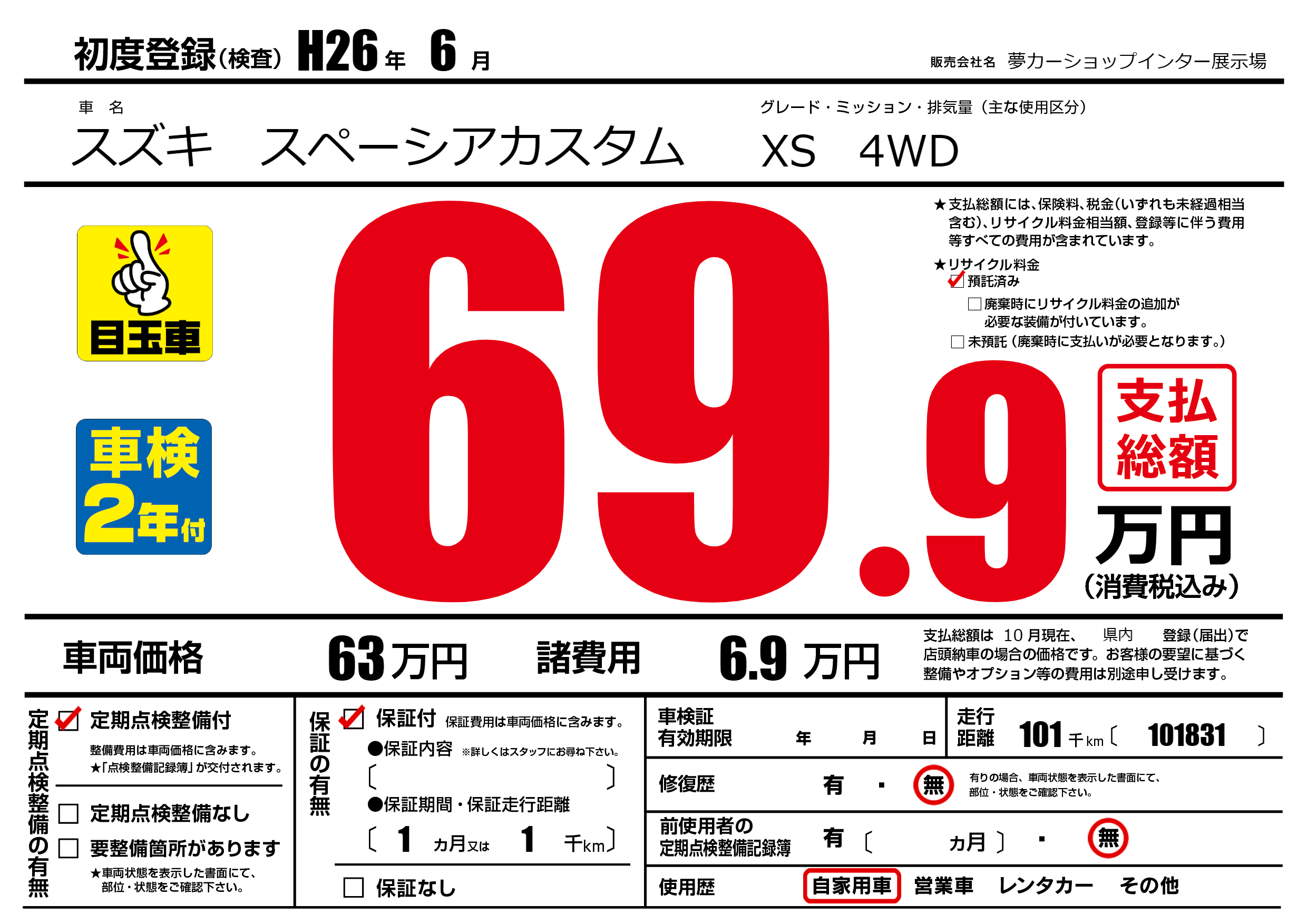 | 走行キロ | 10.1万km | 初年度登録 | H26年6月 |
