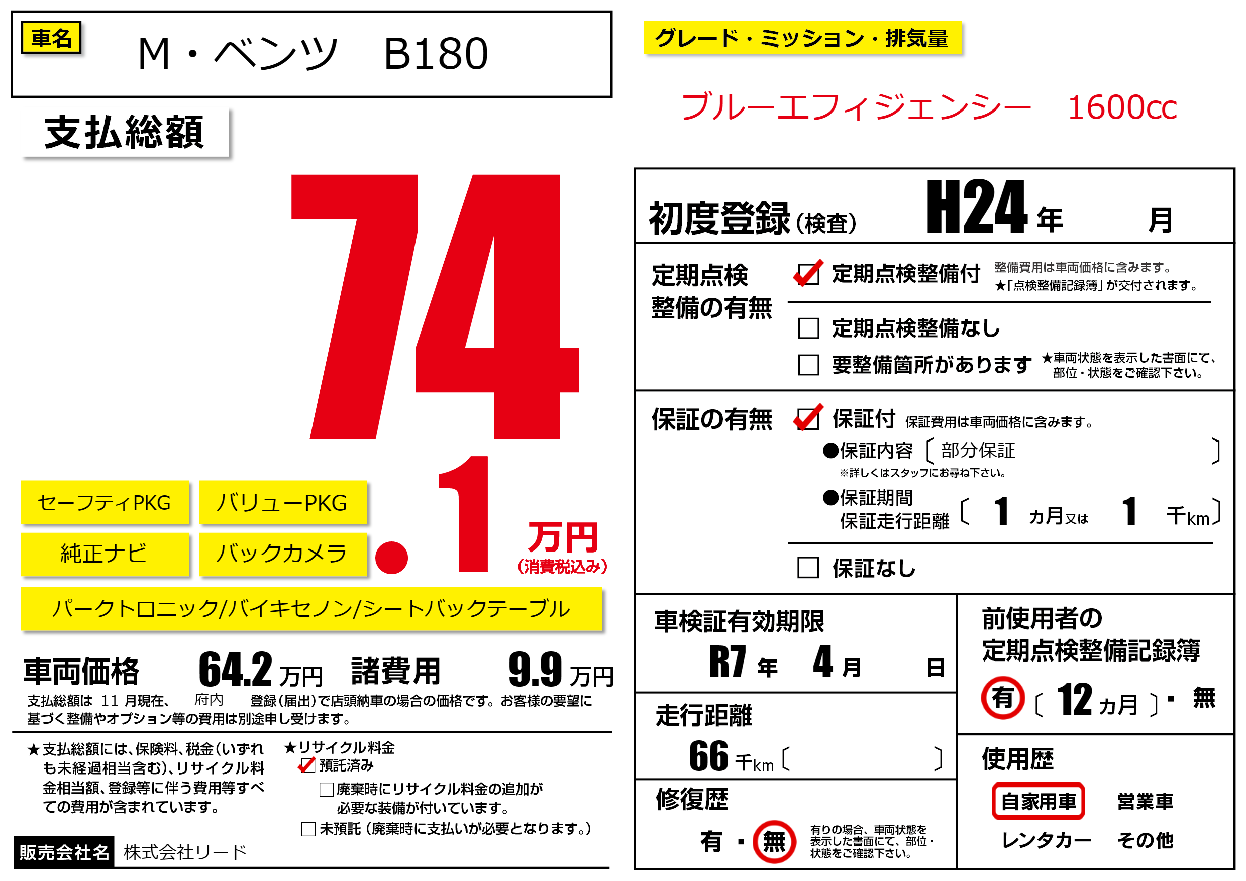 | 車名 | M・ベンツ B180 | グレード ミッション 排気量 |