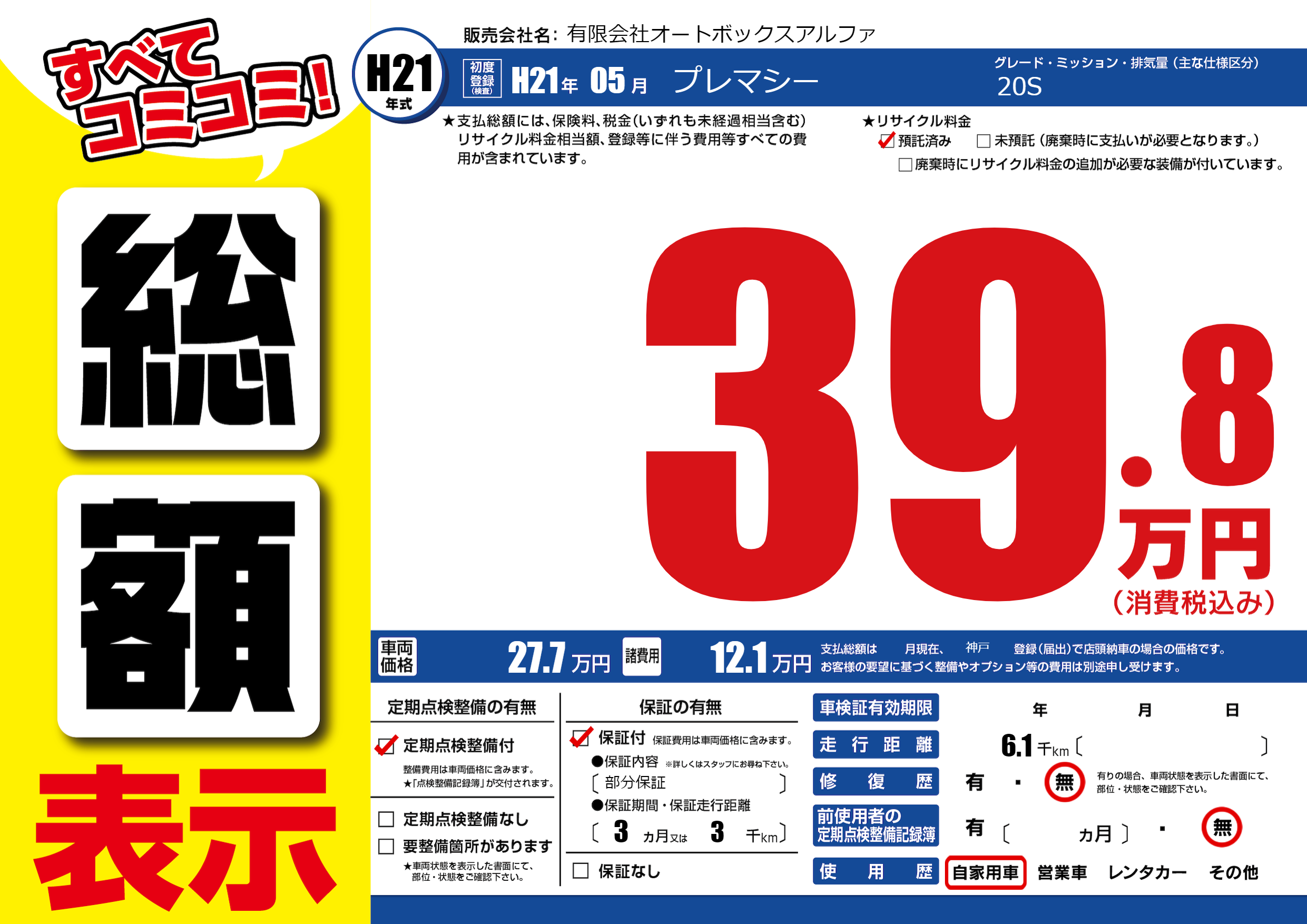 | 車名 | プレマシー | グレード ミッション 排気量 |