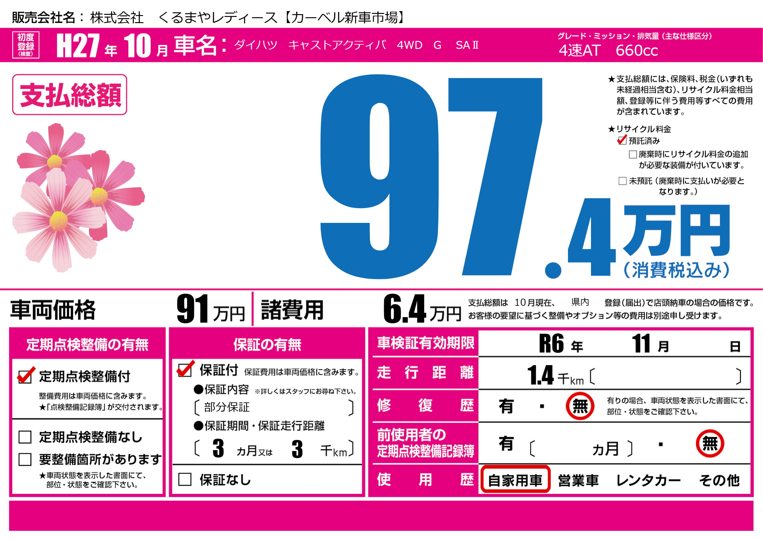 | 車検制限 | R6年 11月 - 日 | ||