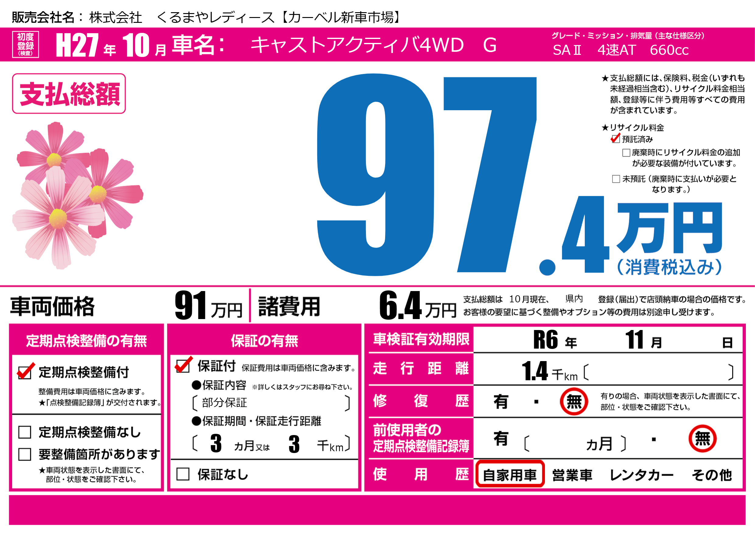 | 車名 | キャストアクティバ4WD G | グレード ミッション 排気量 |