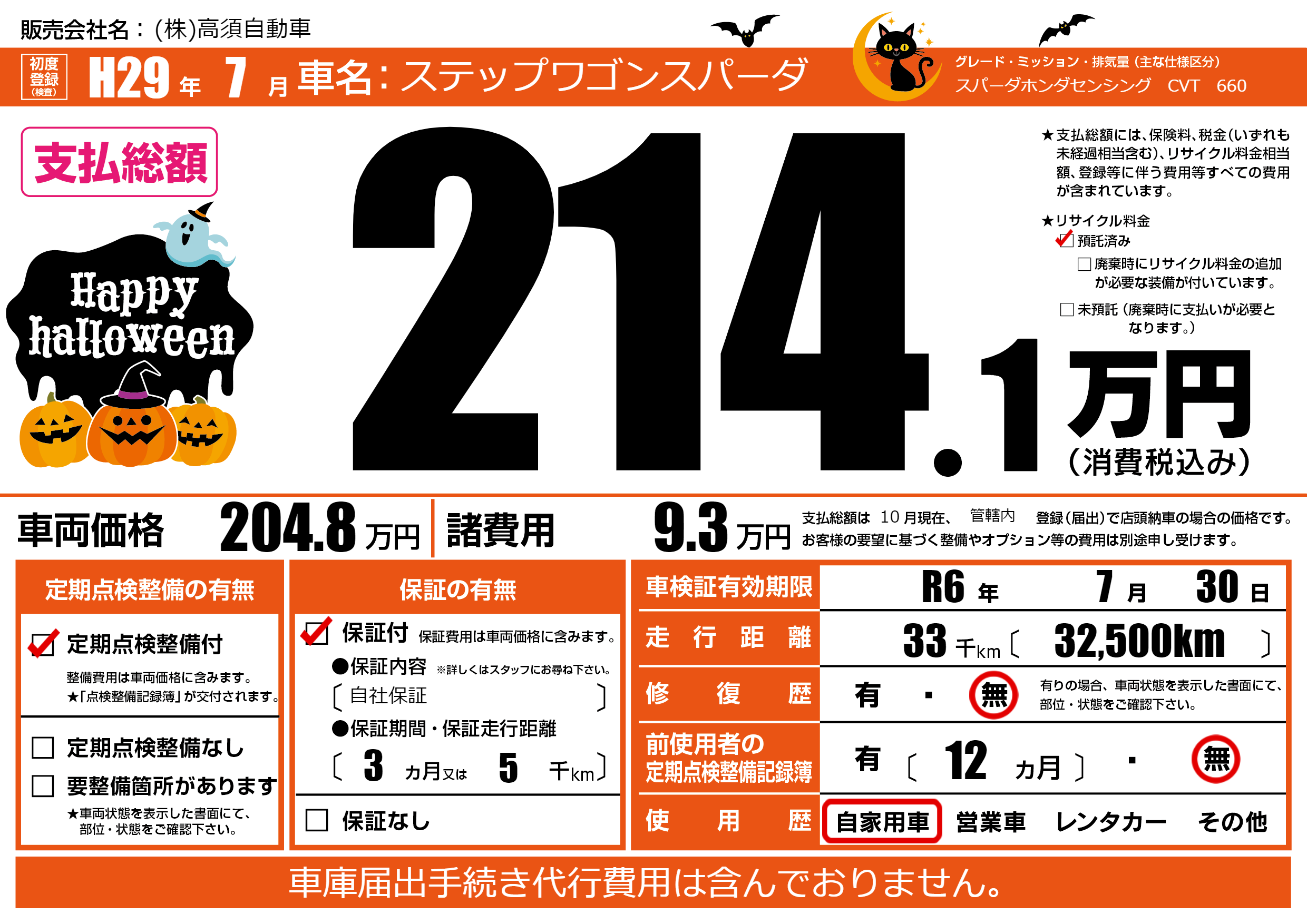 | 走行キロ | 3.3万km | 初年度登録 | H29年7月 |