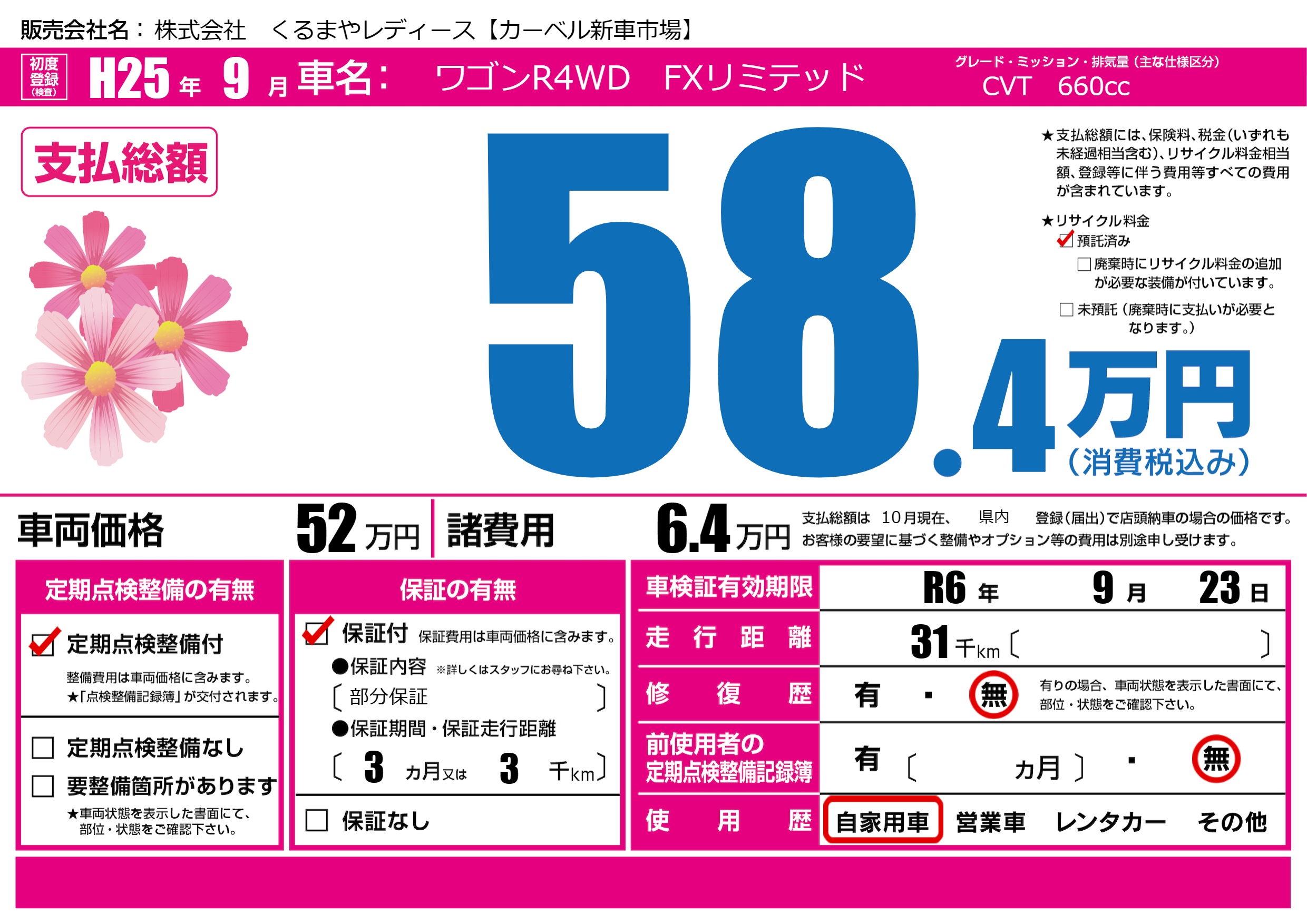 | 走行キロ | 3.1万km | 初年度登録 | H25年9月 |