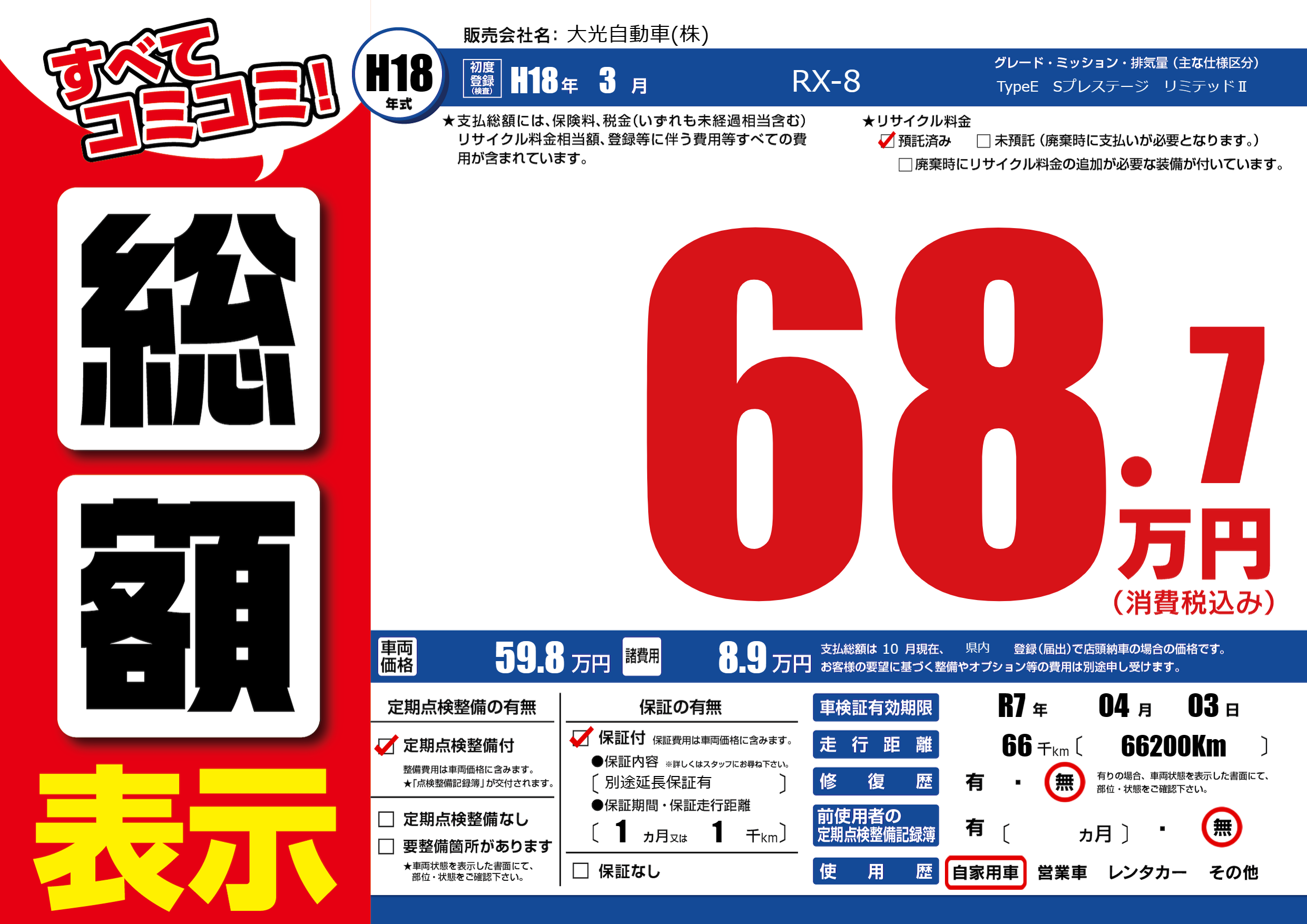| 車名 | RX-8 | グレード ミッション 排気量 |