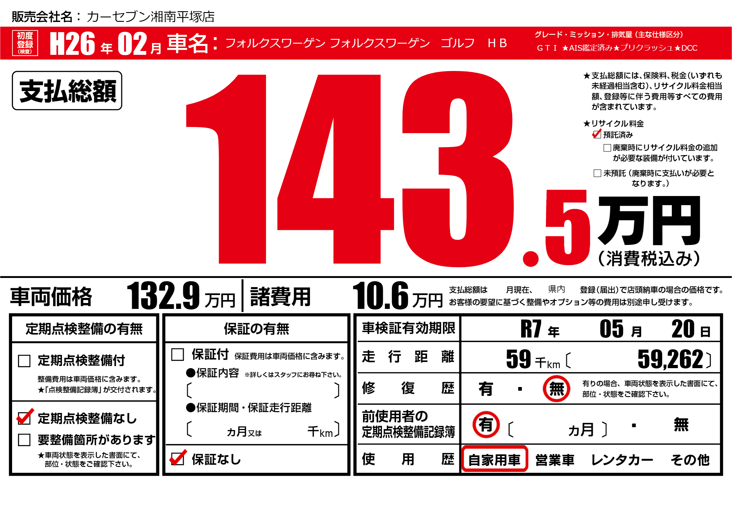 | 車検制限 | R7年 05月 20日 | ||