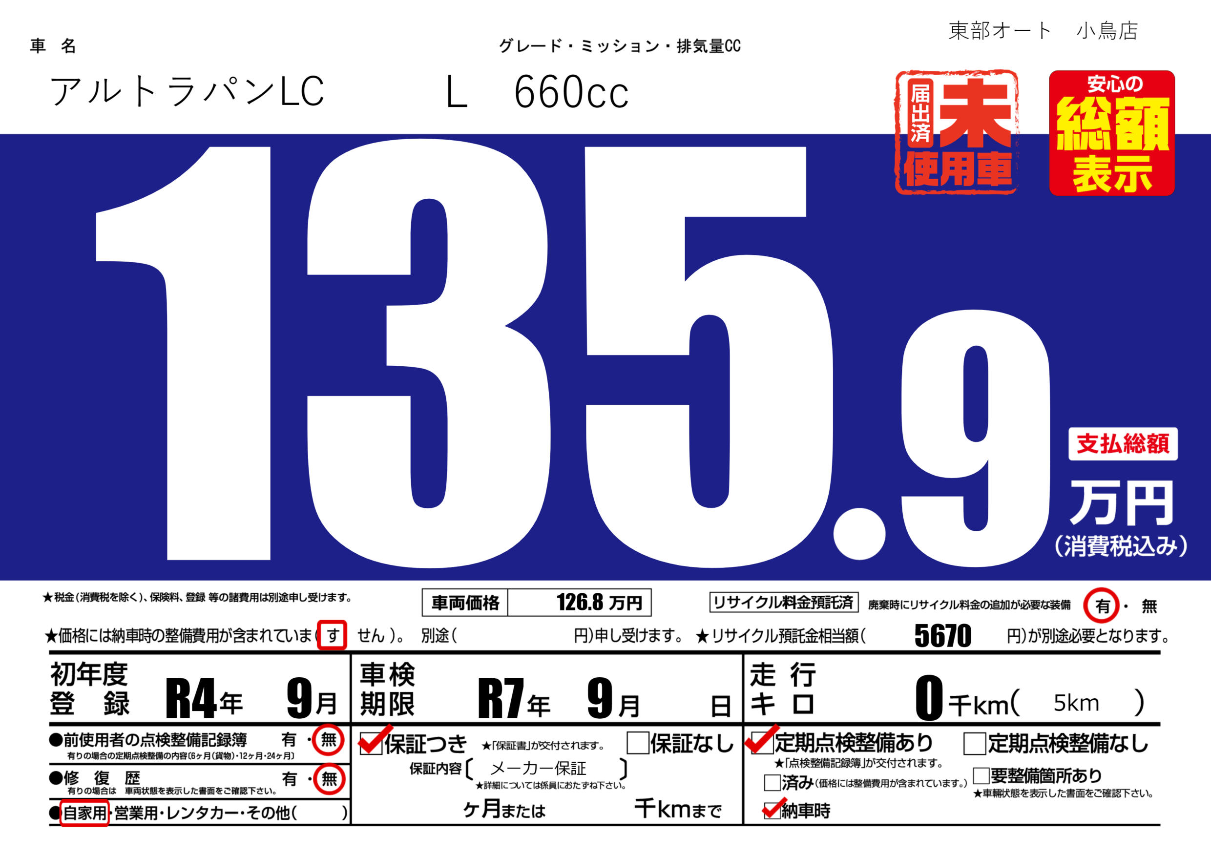 | 定期点検整備 | 定期点検整備あり 納車時あり | ||