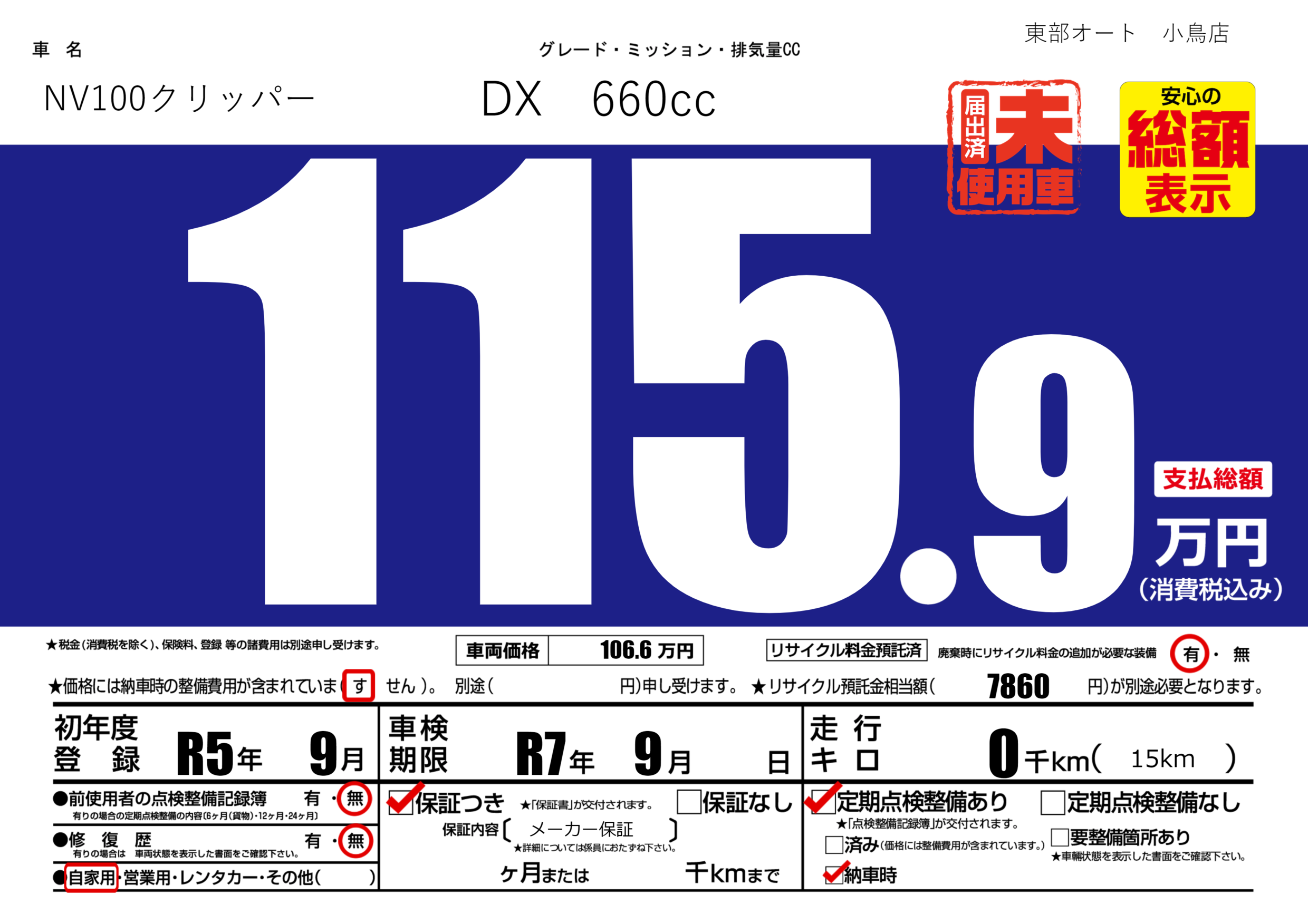 | 定期点検整備 | 定期点検整備あり 納車時あり | ||