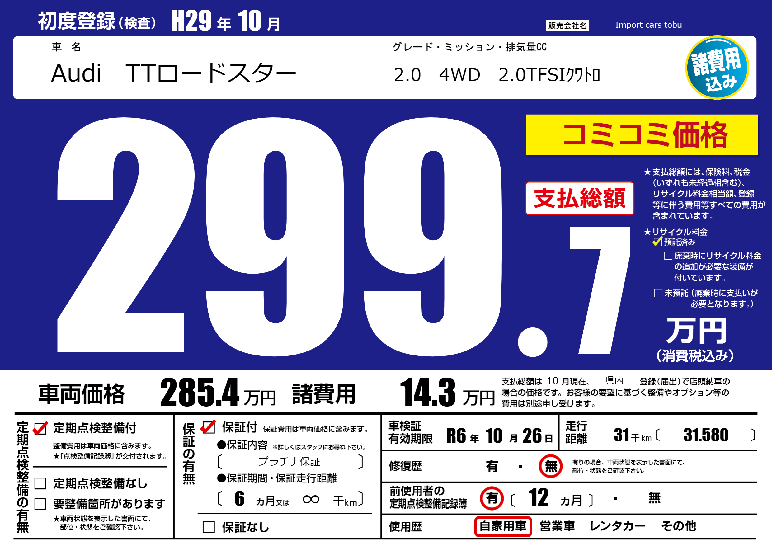 | 車名 | Audi TTロードスター | グレード ミッション 排気量 |