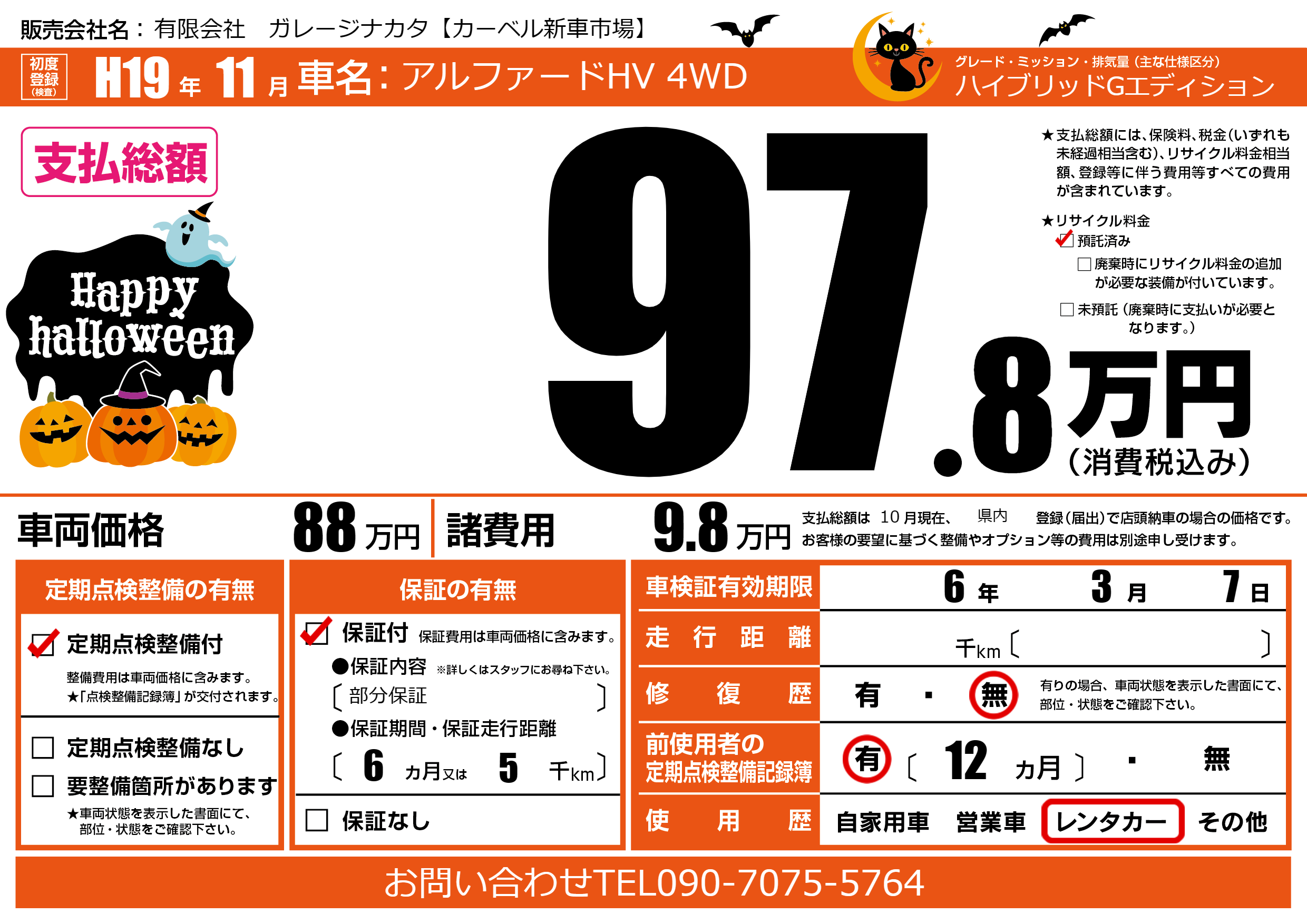 | 走行キロ | - | 初年度登録 | H19年11月 |