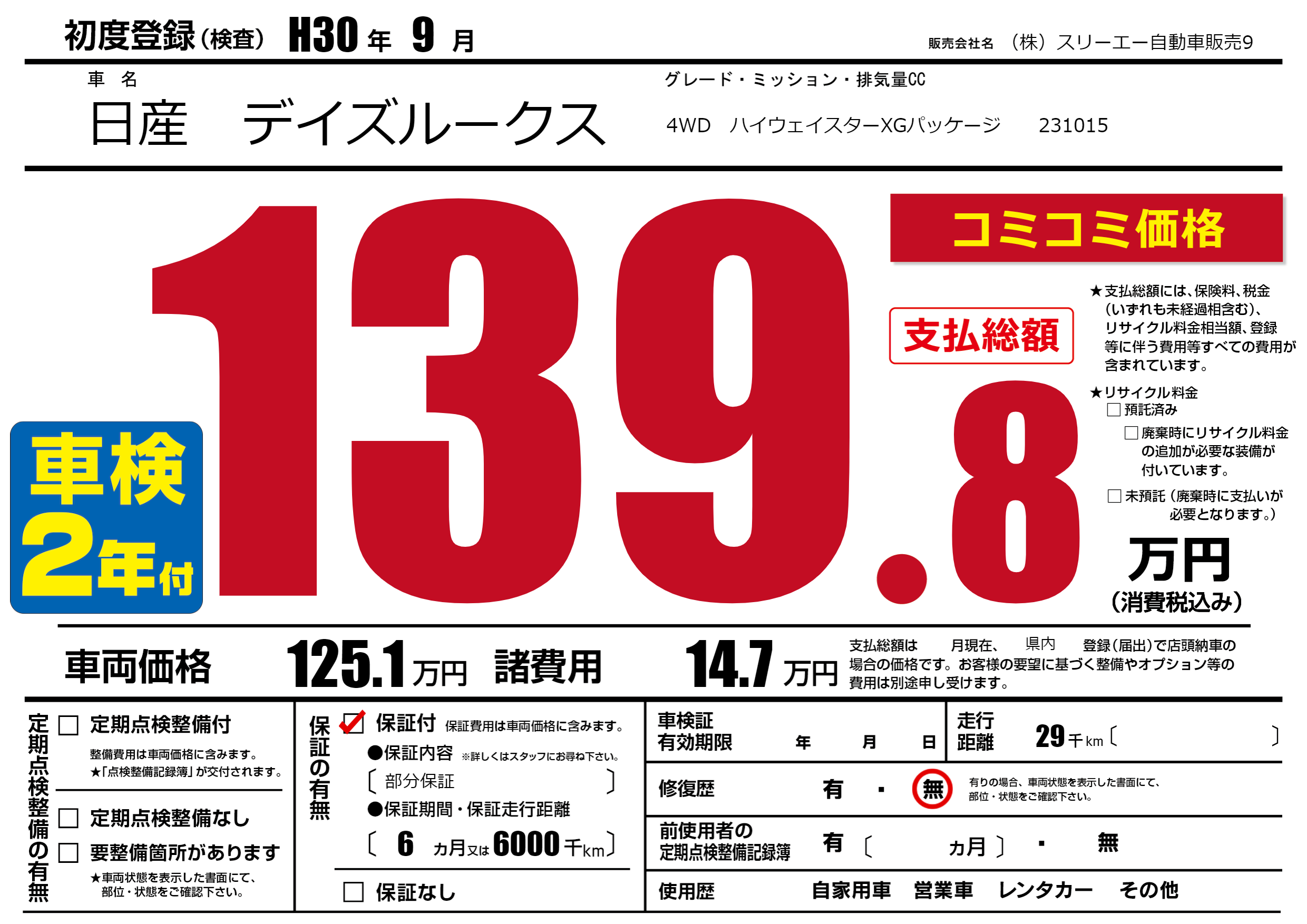 保証付き 保証内容(部分保証) 6ヶ月または(6000)千kmまで |