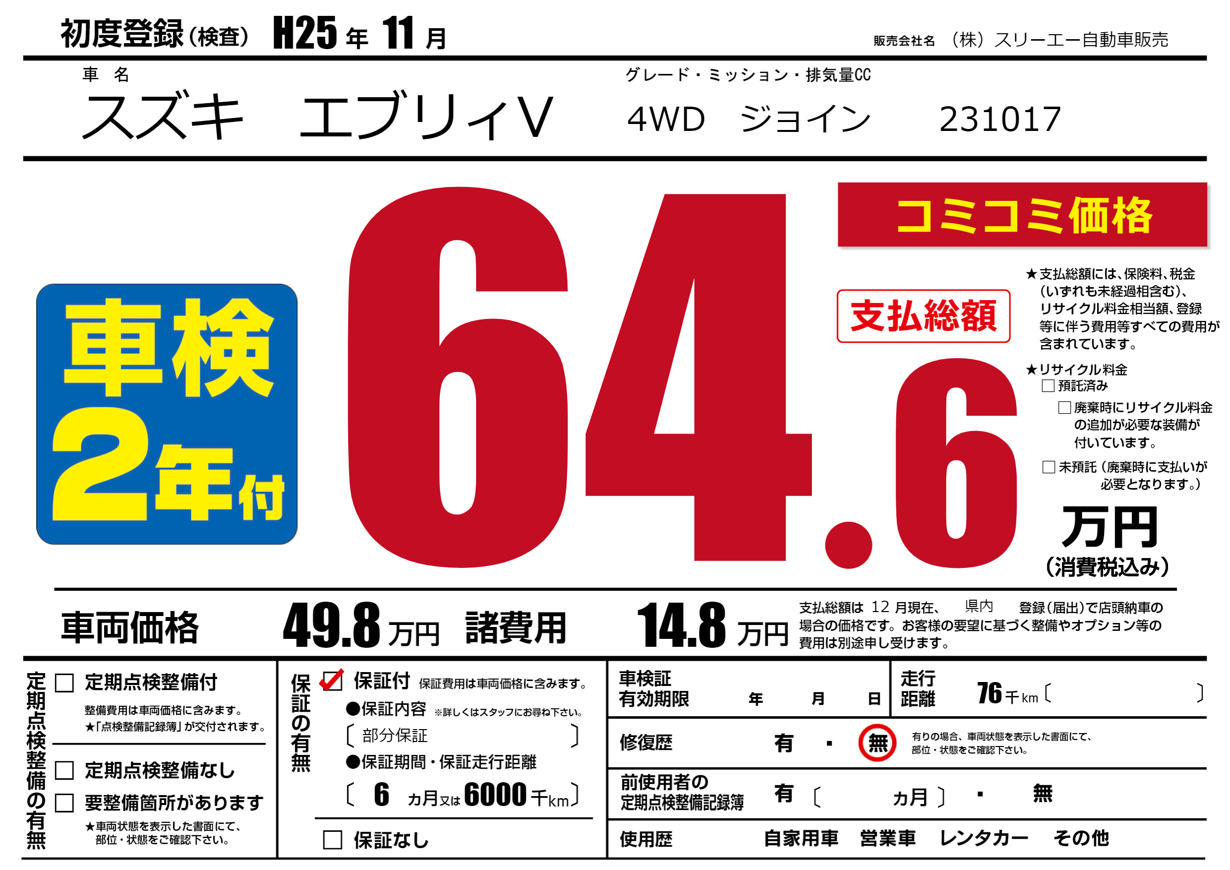 | 車名 | スズキ エブリィV | グレード ミッション 排気量 |