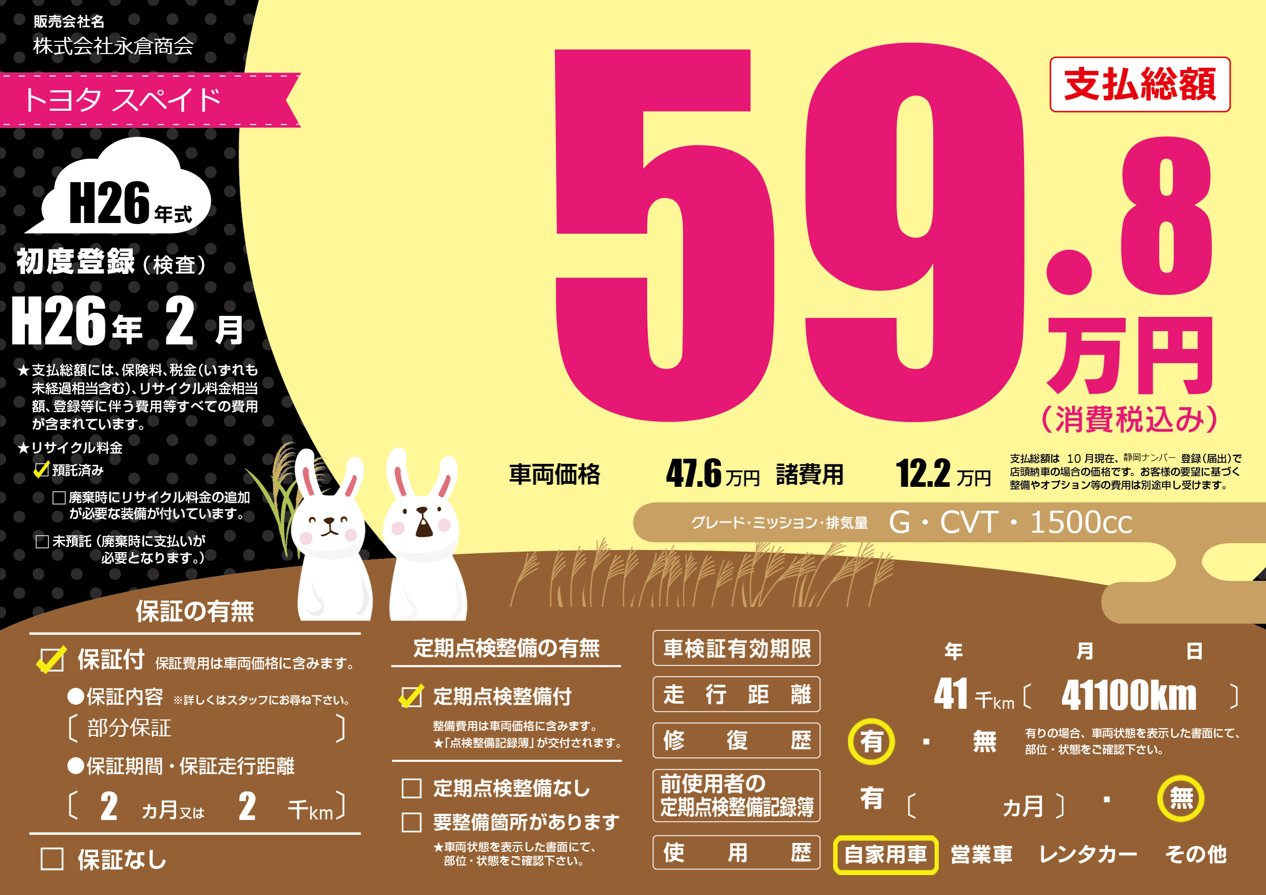 | 車名 | トヨタ スペイド | グレード ミッション 排気量 |
