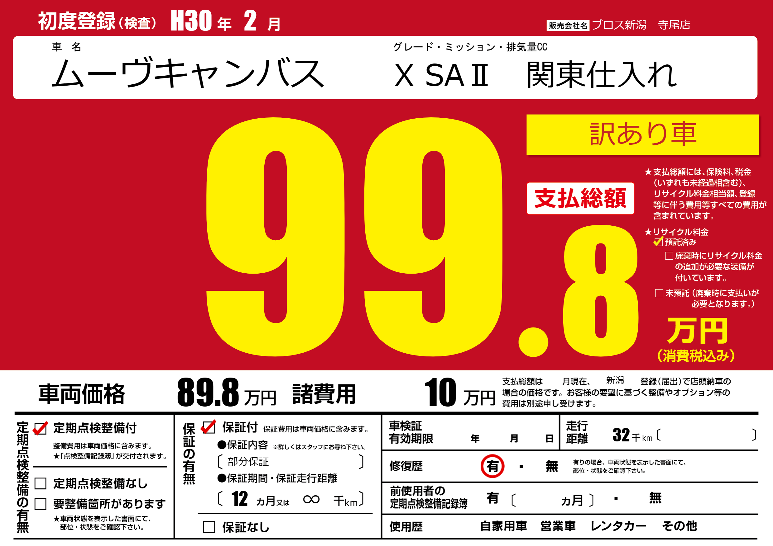 保証付き 保証内容(部分保証) 12ヶ月または∞千km |