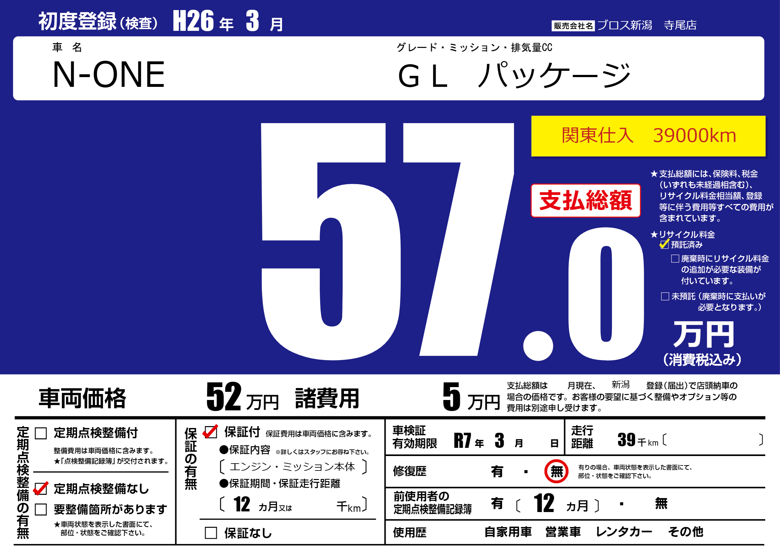 | 車名 | N-ONE | グレード ミッション 排気量 |