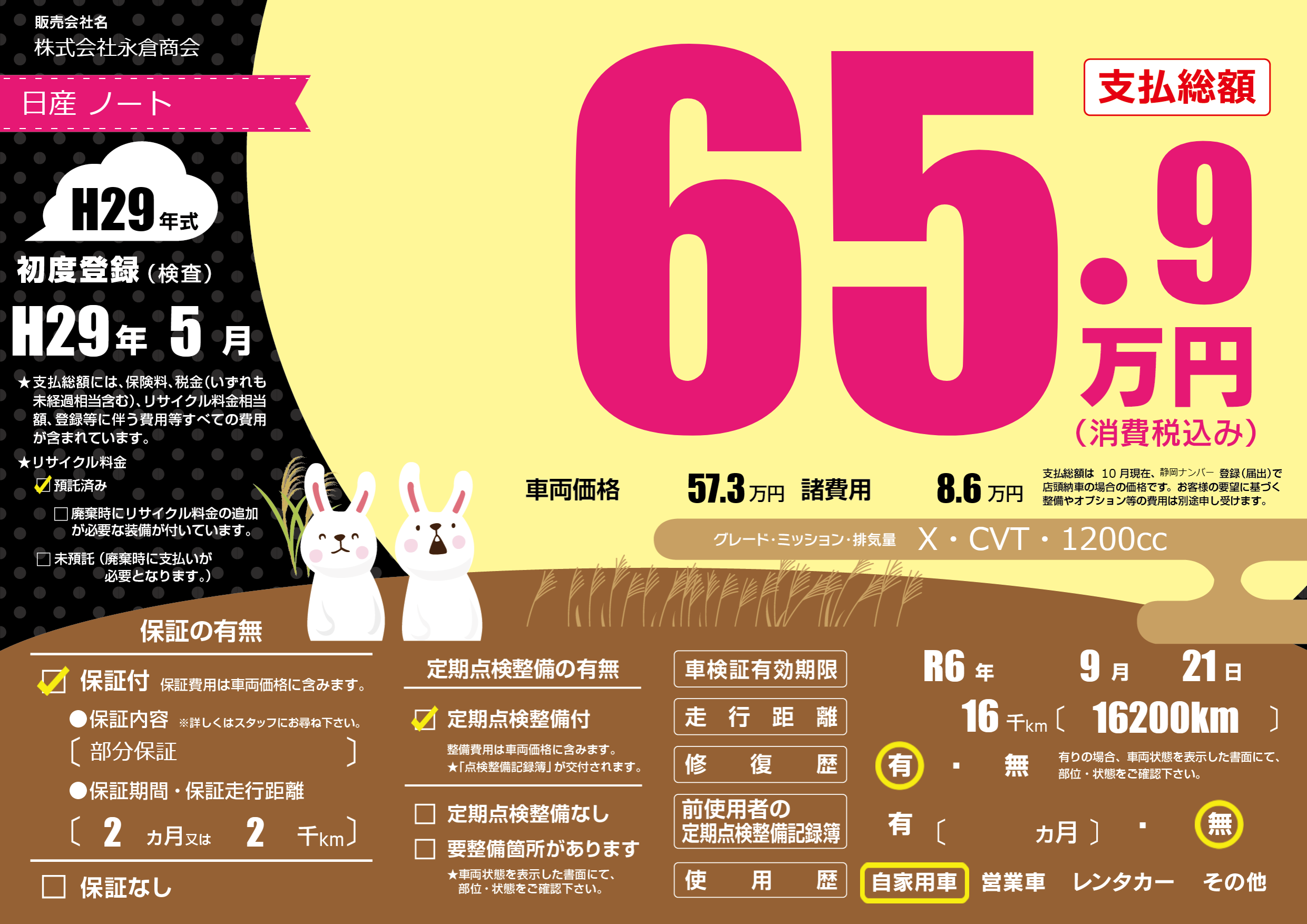 | 車名 | 日産 ノート | グレード ミッション 排気量 |