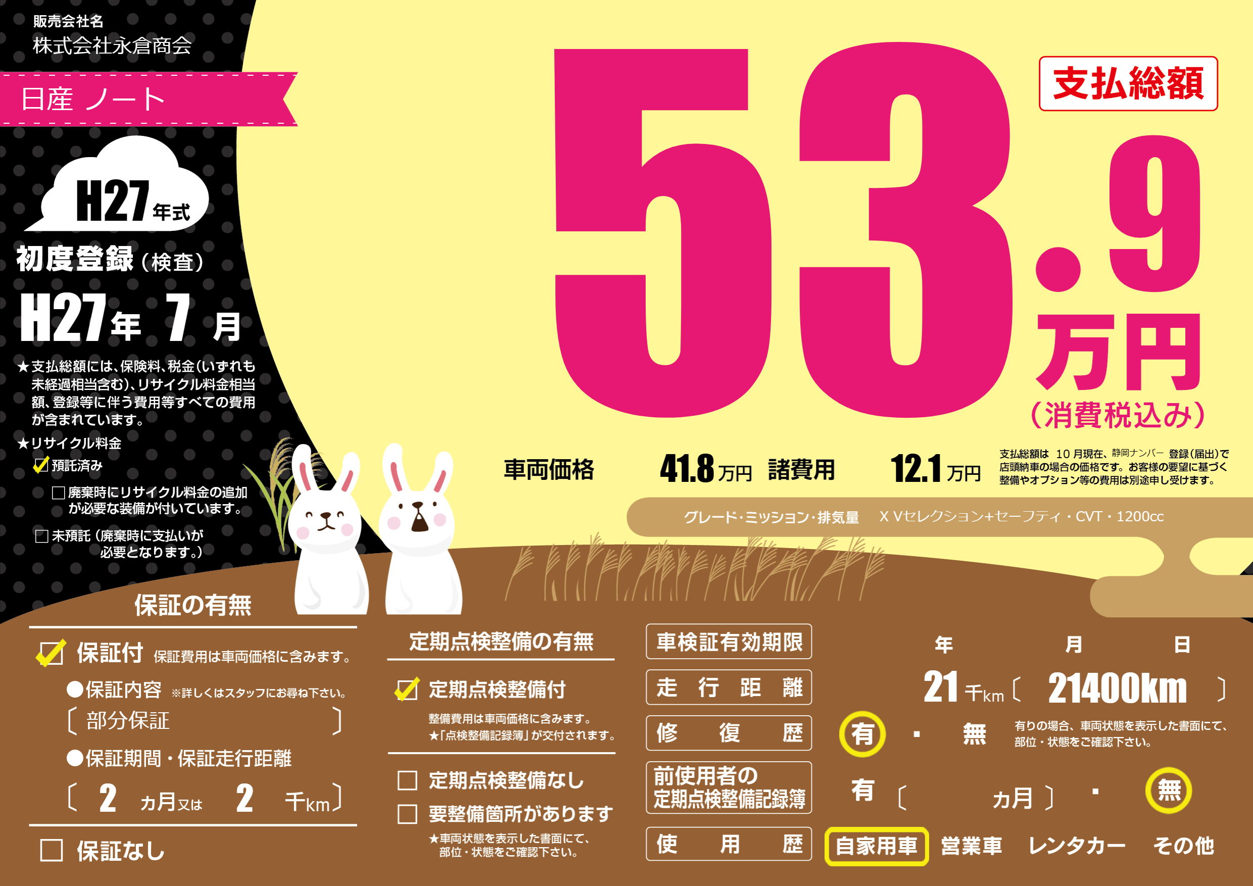| 車名 | 日産 ノート | グレード ミッション 排気量 |