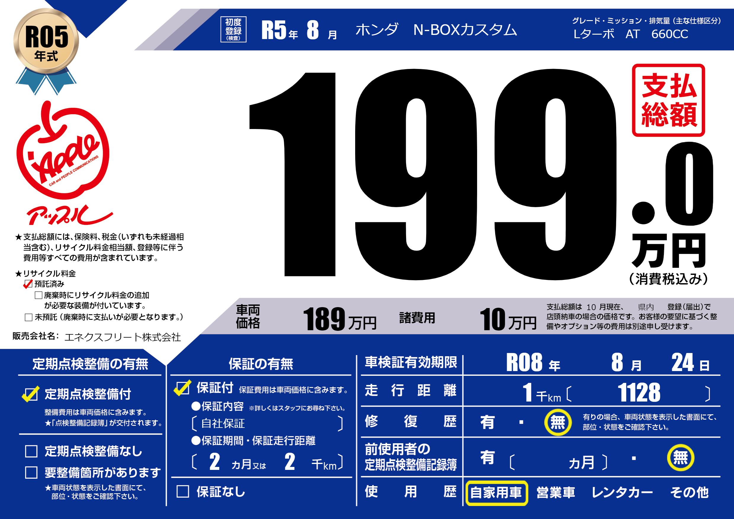 | 走行キロ | 0.1万km | 初年度登録 | R5年8月 |