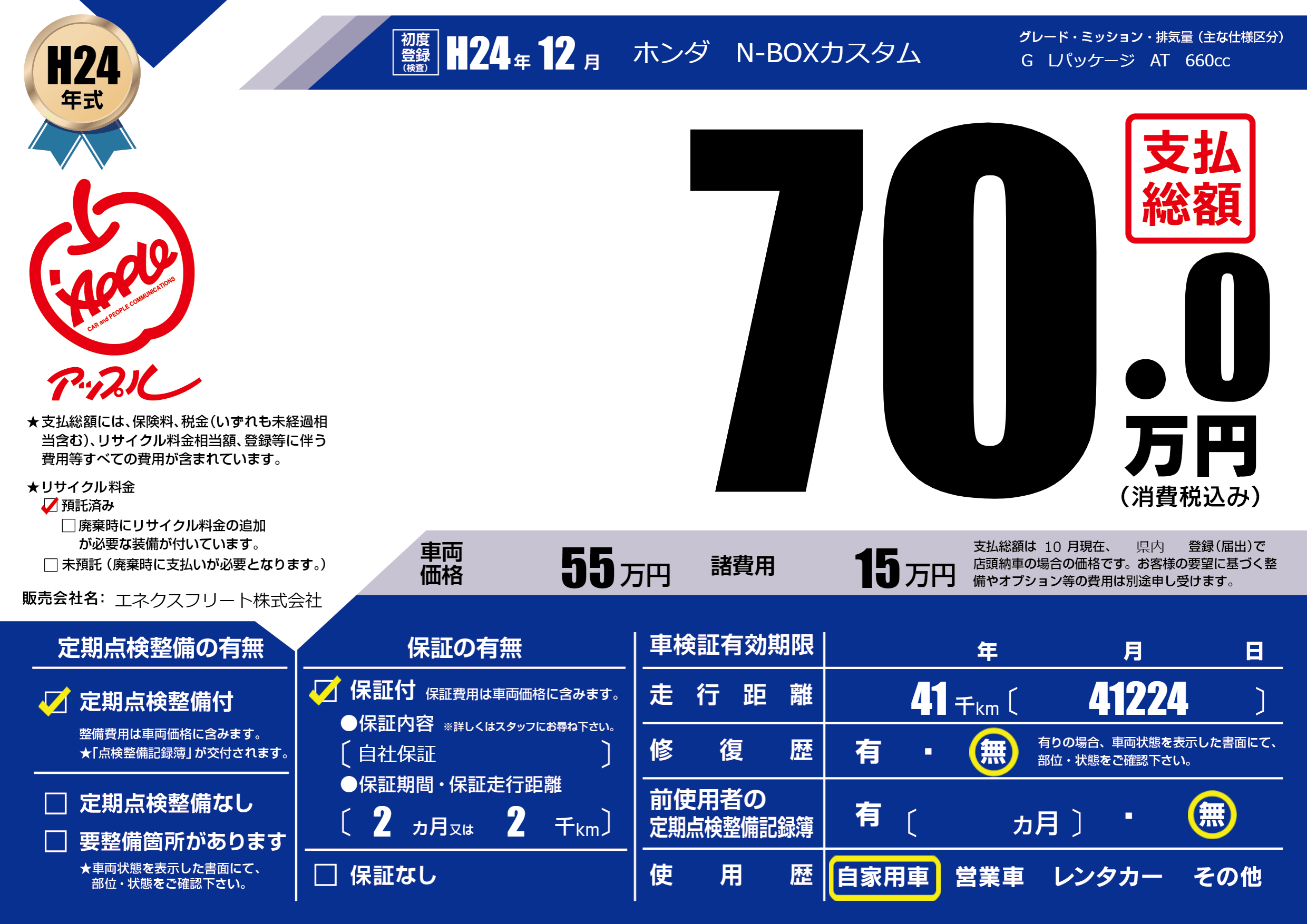 | 走行キロ | 4.1万km | 初年度登録 | H24年12月 |