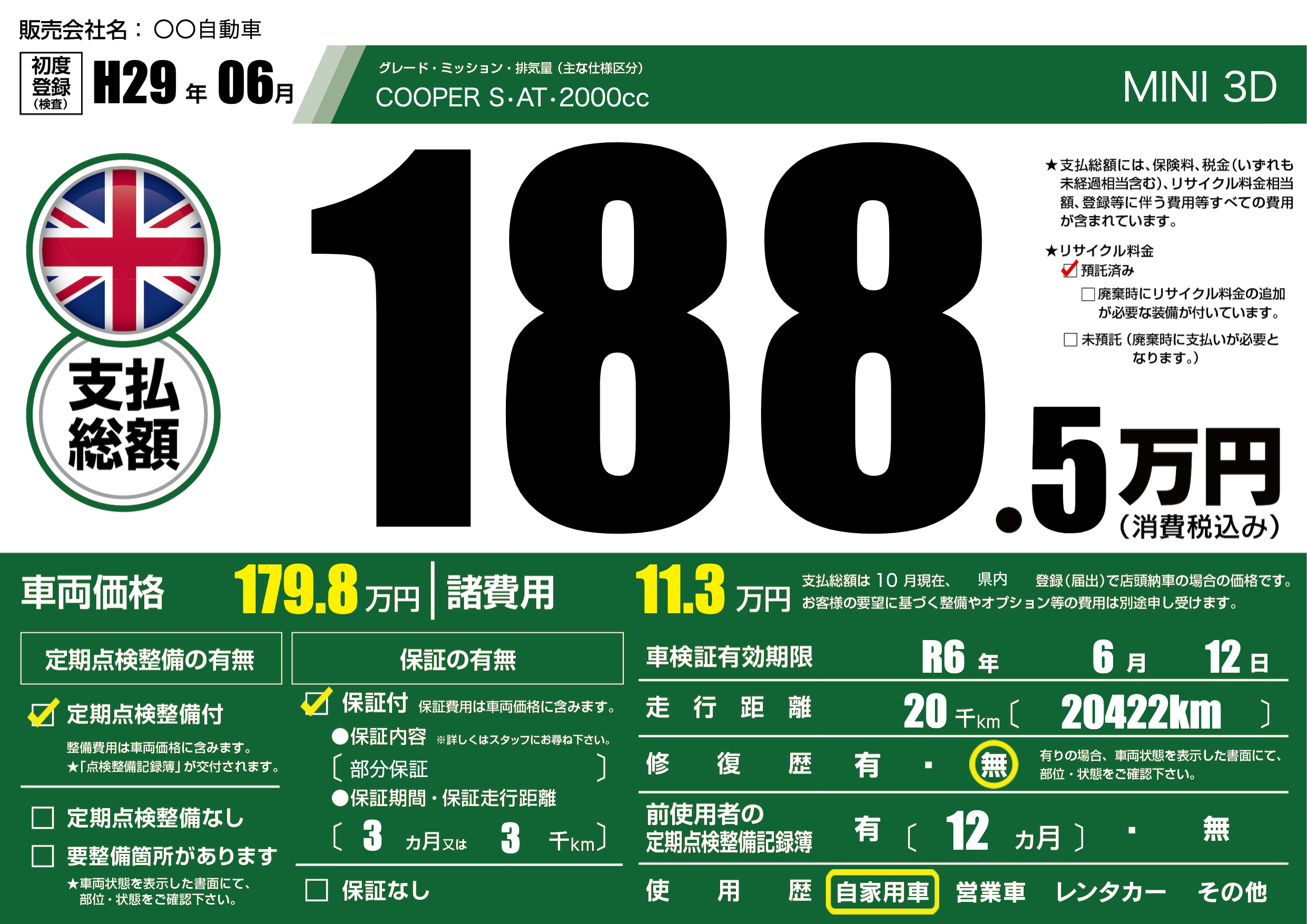 | 車名 | MINI 3D | グレード ミッション 排気量 |