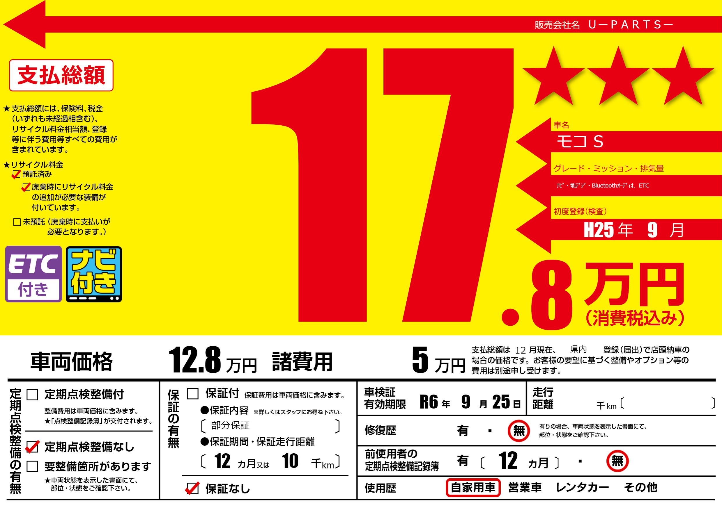 | 車名 | モコ S | グレード ミッション 排気量 |