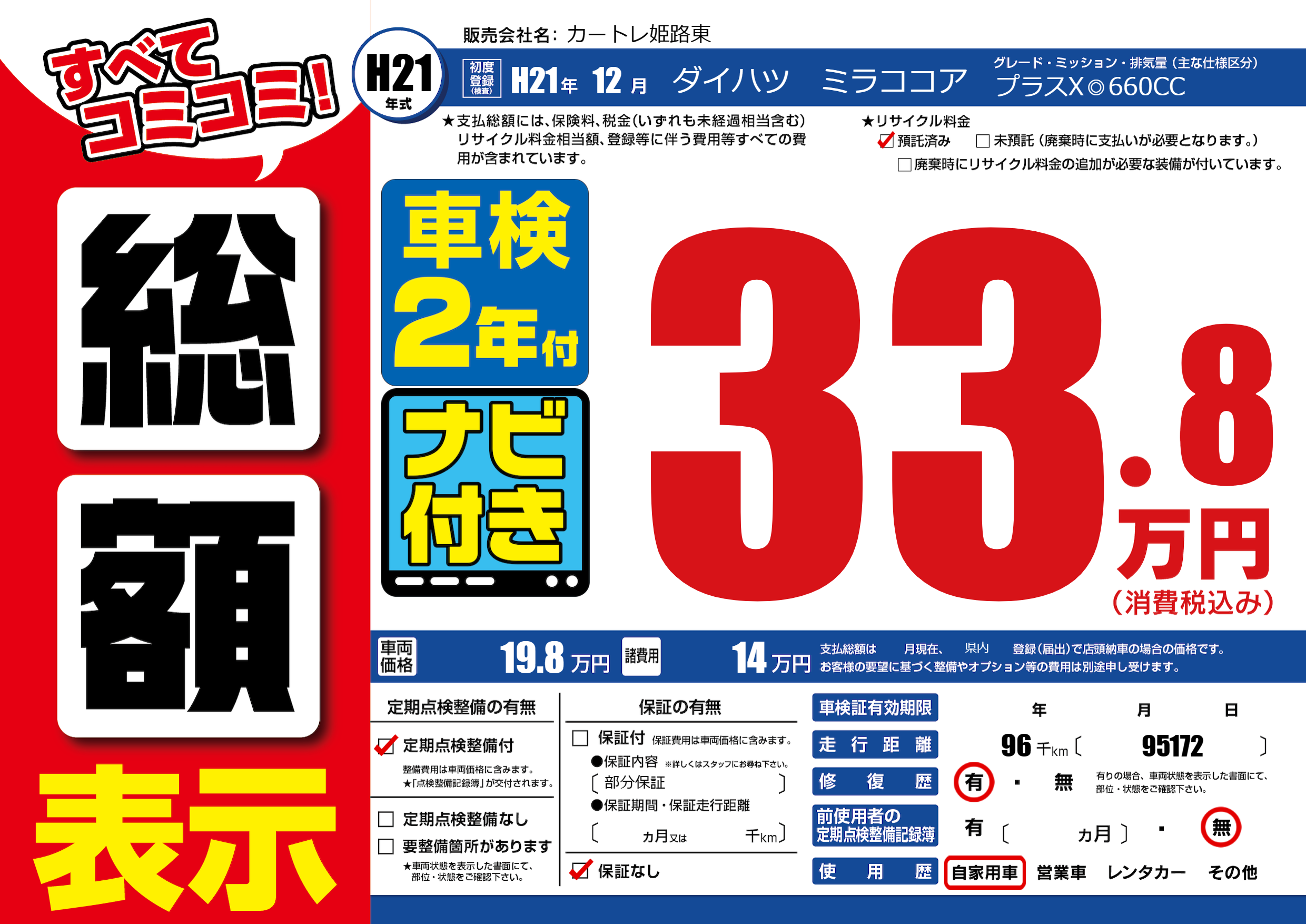 | 車名 | ダイハツ ミラココア | グレード ミッション 排気量 |
