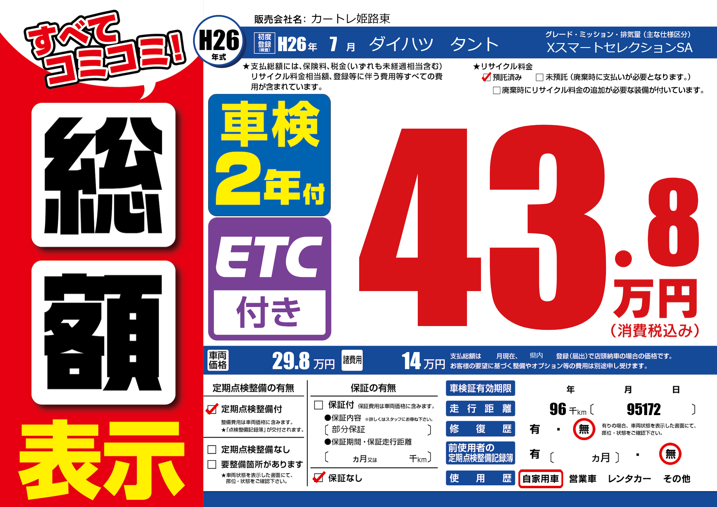 | 車名 | ダイハツ タント | グレード ミッション 排気量 |