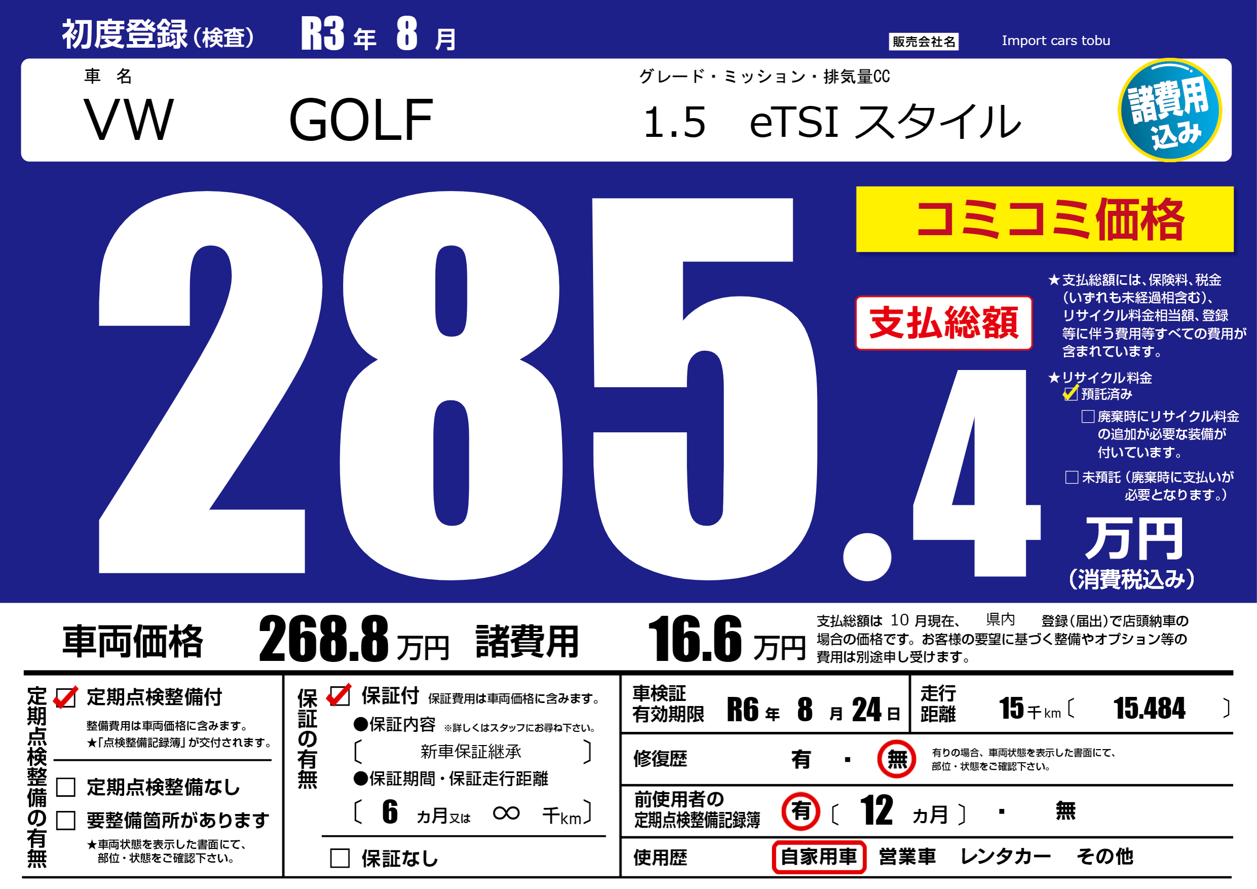 | 車名 | VW GOLF | グレード ミッション 排気量 |