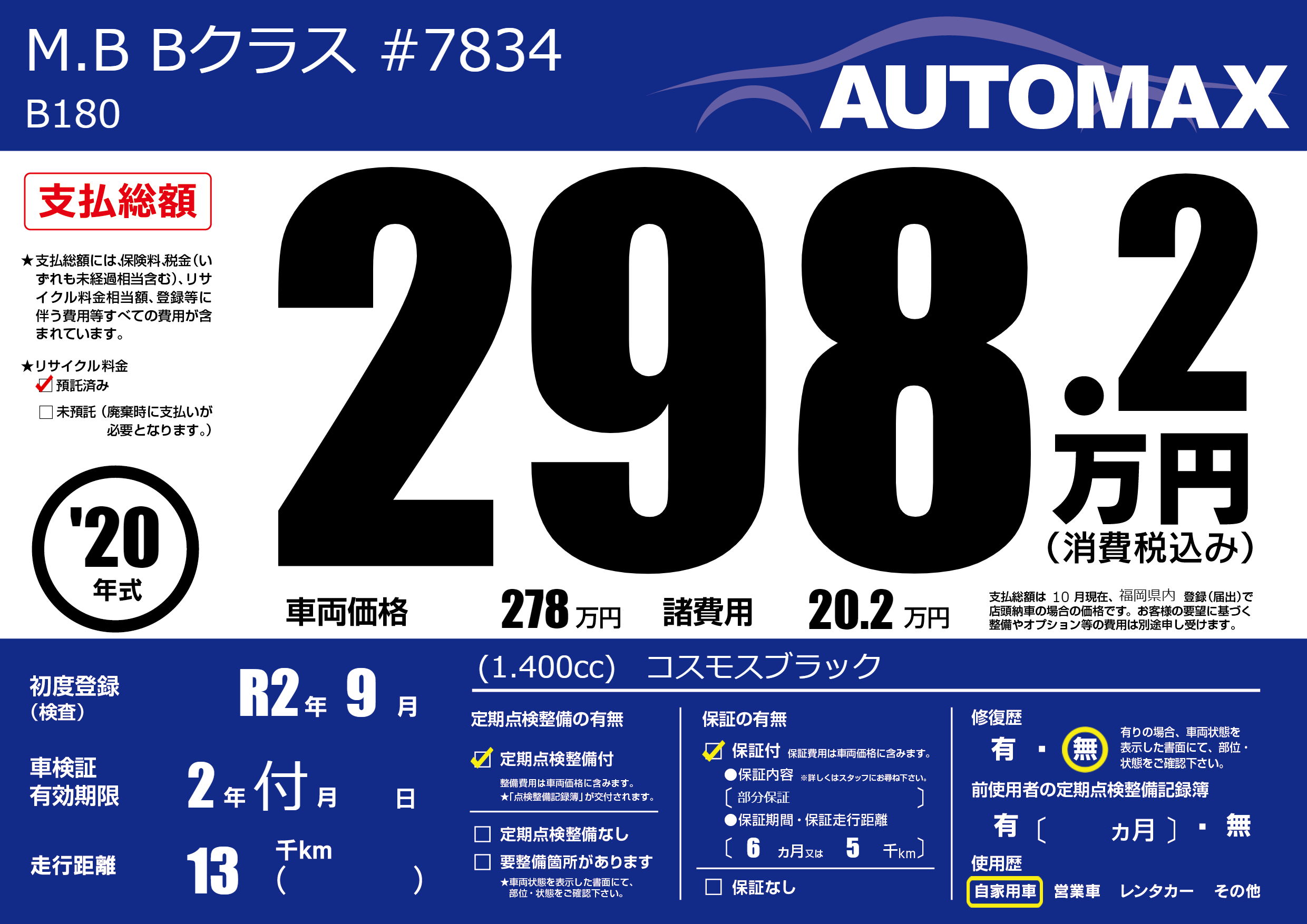 | 車名 | M.B Bクラス #7834 | グレード ミッション 排気量 |