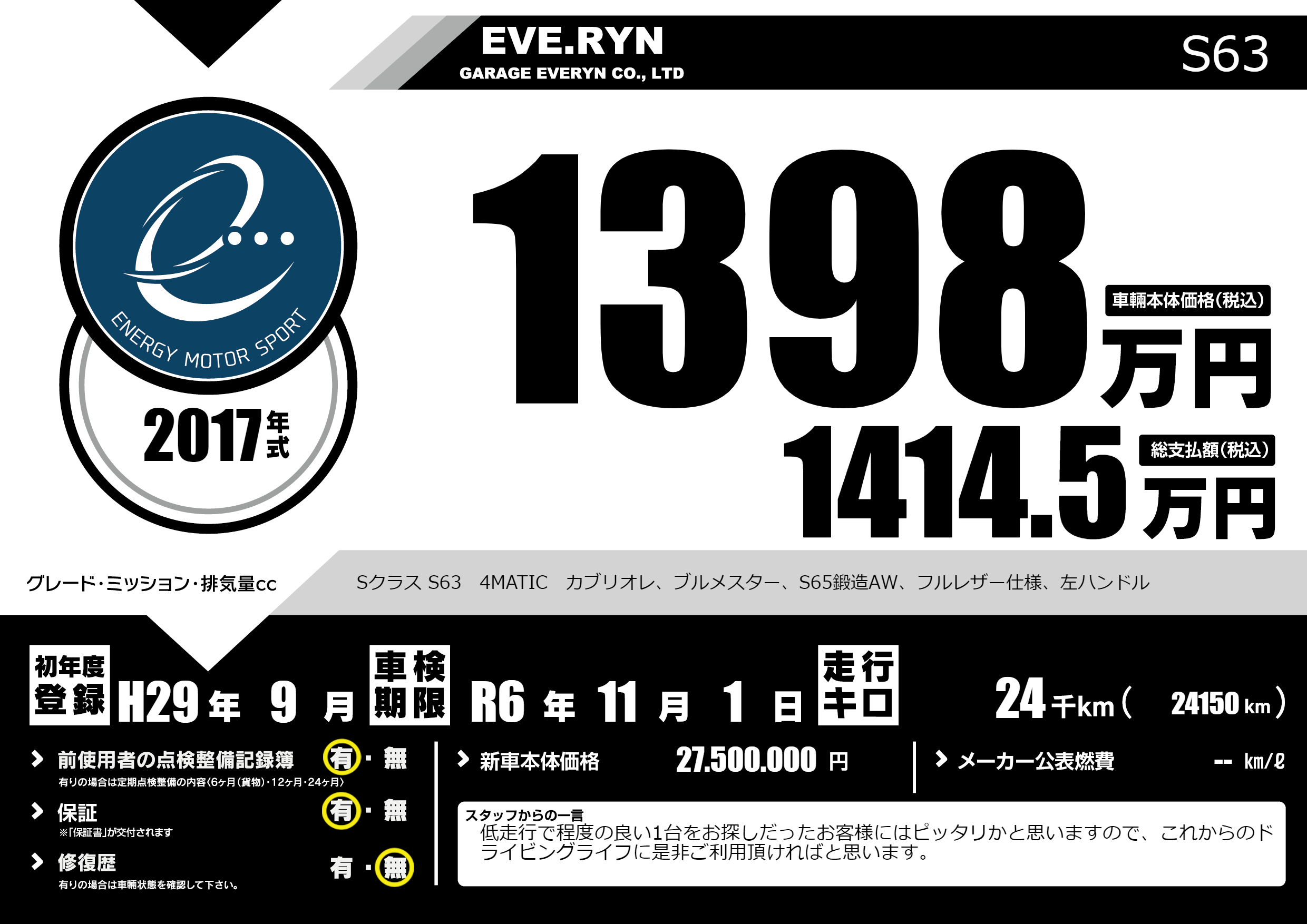Sクラス S63 4MATIC カブリオレ、ブルメスター、S65鍛造AW、フルレザー仕様、左ハンドル |