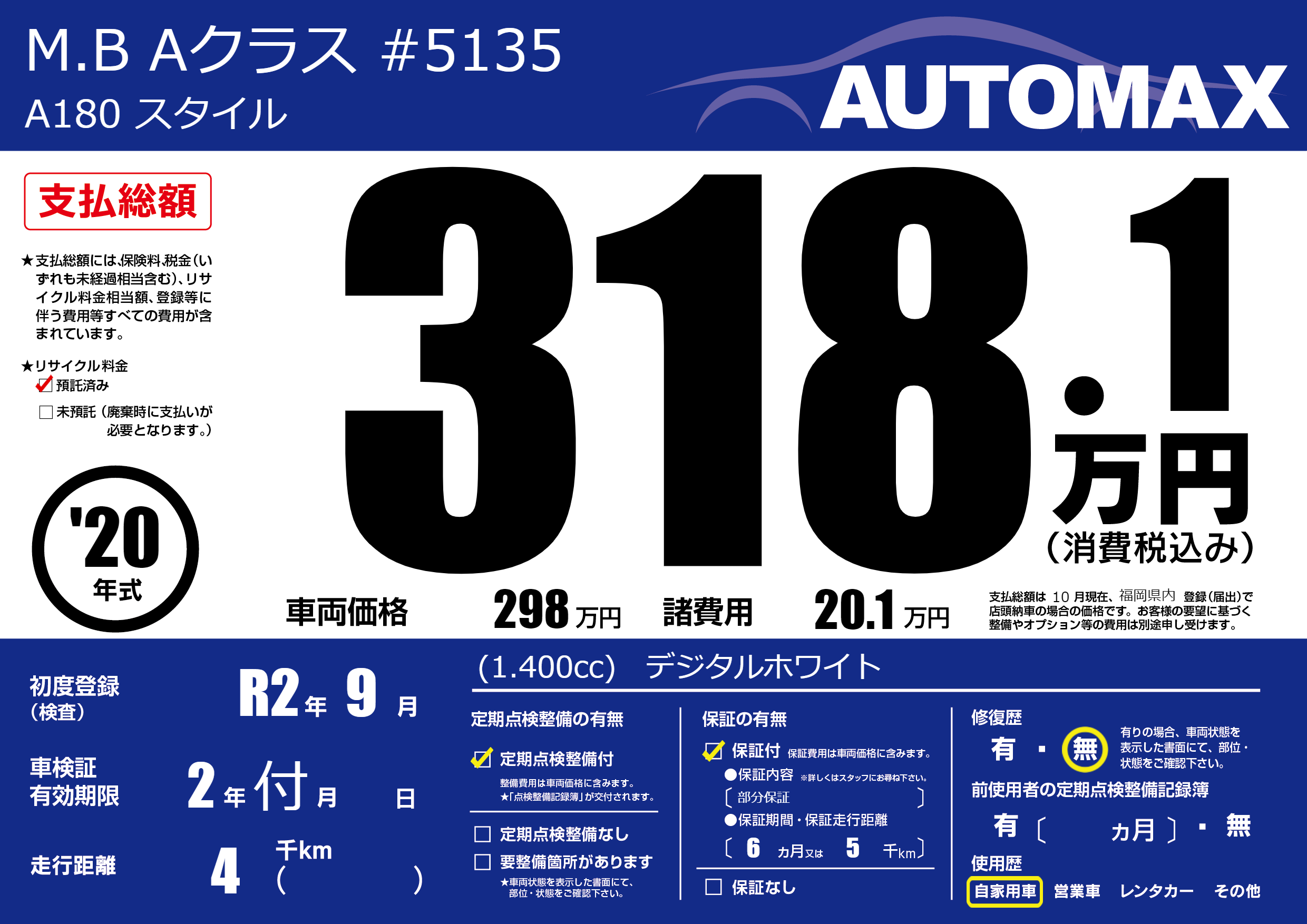 | 車名 | M.B Aクラス #5135 | グレード ミッション 排気量 |