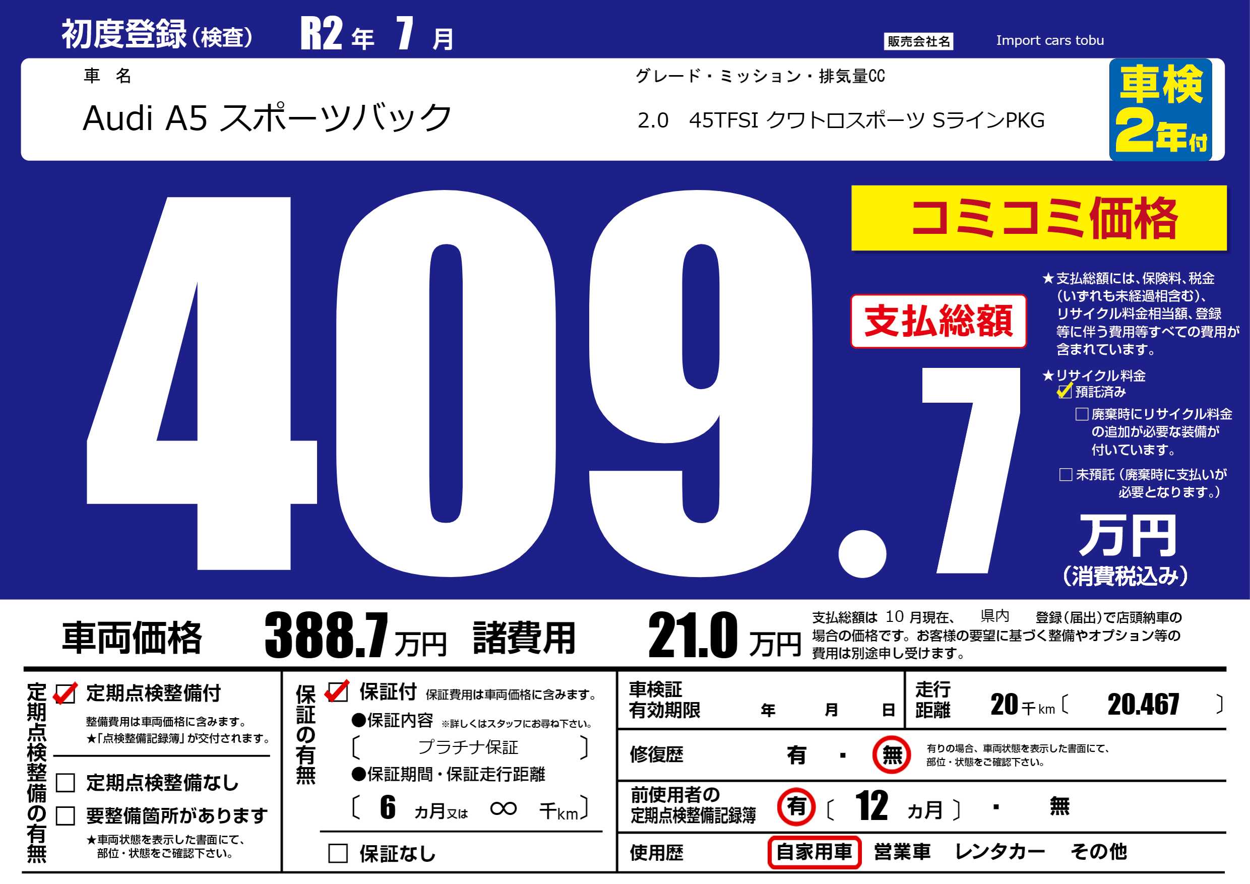 | 車名 | Audi A5 スポーツバック | グレード ミッション 排気量 |
