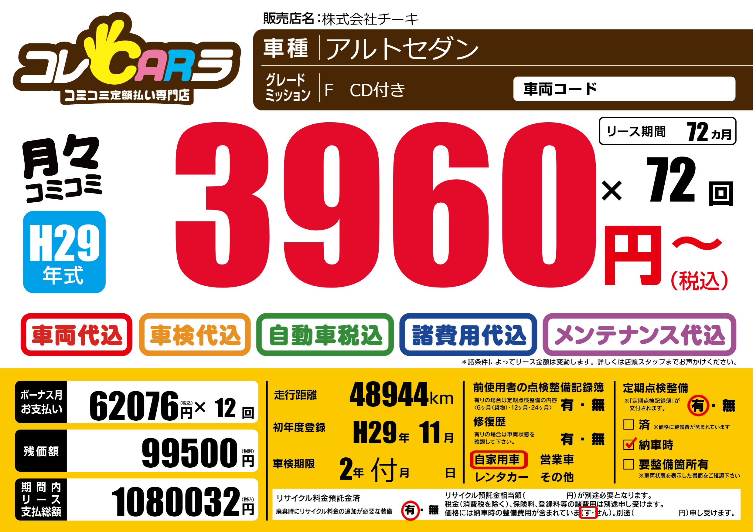 | 定期点検整備 | 定期点検整備あり 納車時あり | ||