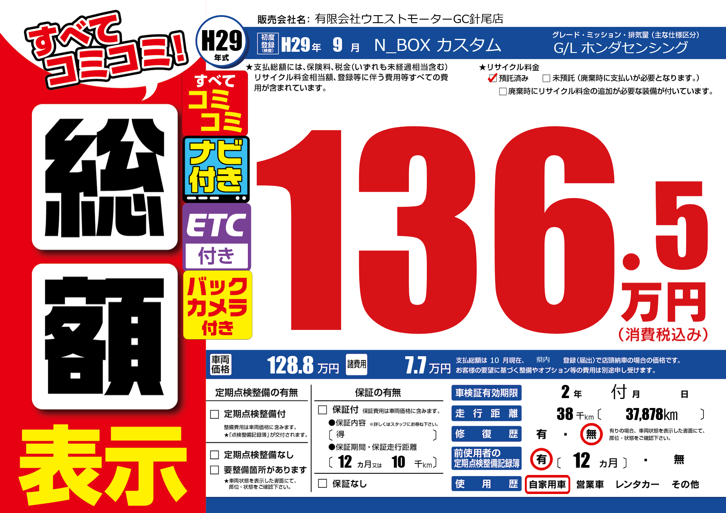 | 走行キロ | 3.8万km | 初年度登録 | H29年9月 |