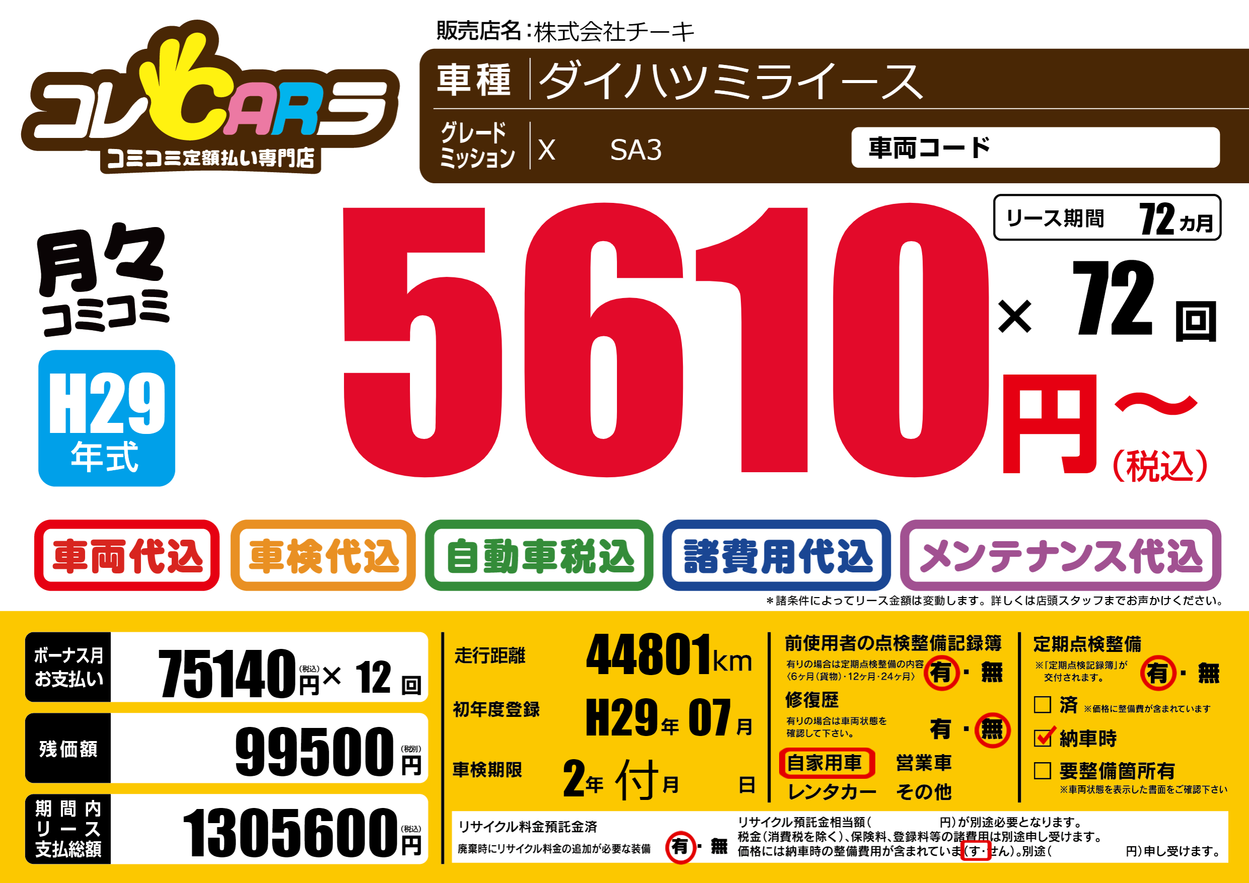 | 車名 | ダイハツミライース | グレード ミッション 排気量 |