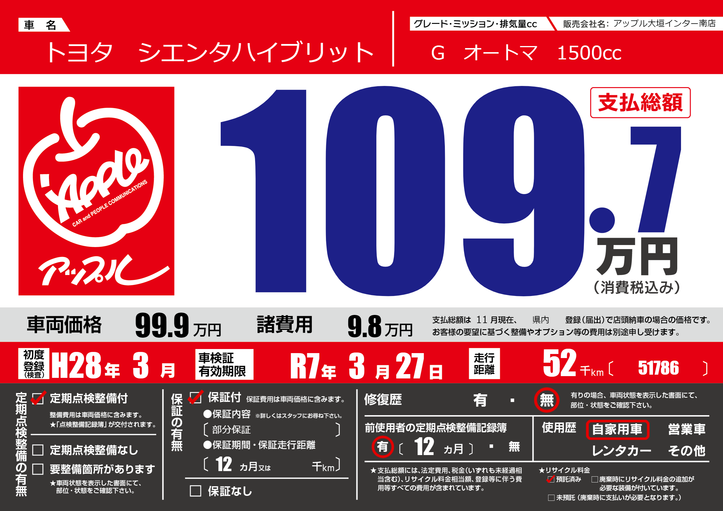 | 車名 | トヨタ シエンタハイブリット | グレード ミッション 排気量 |