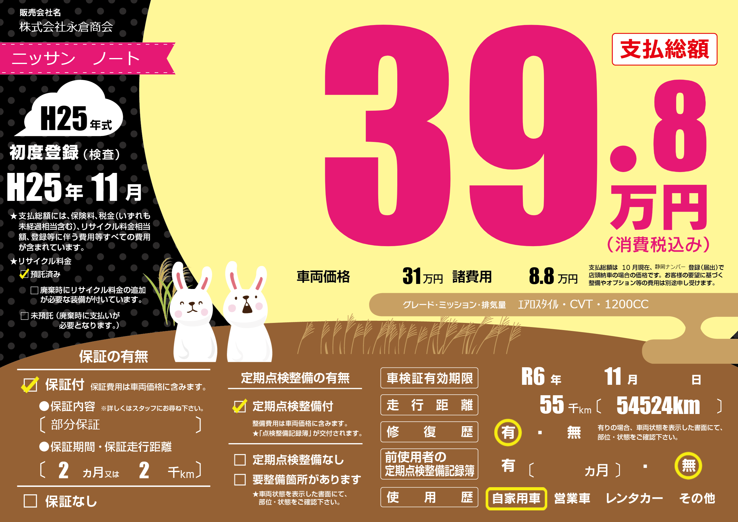 | 車名 | ニッサン ノート | グレード ミッション 排気量 |