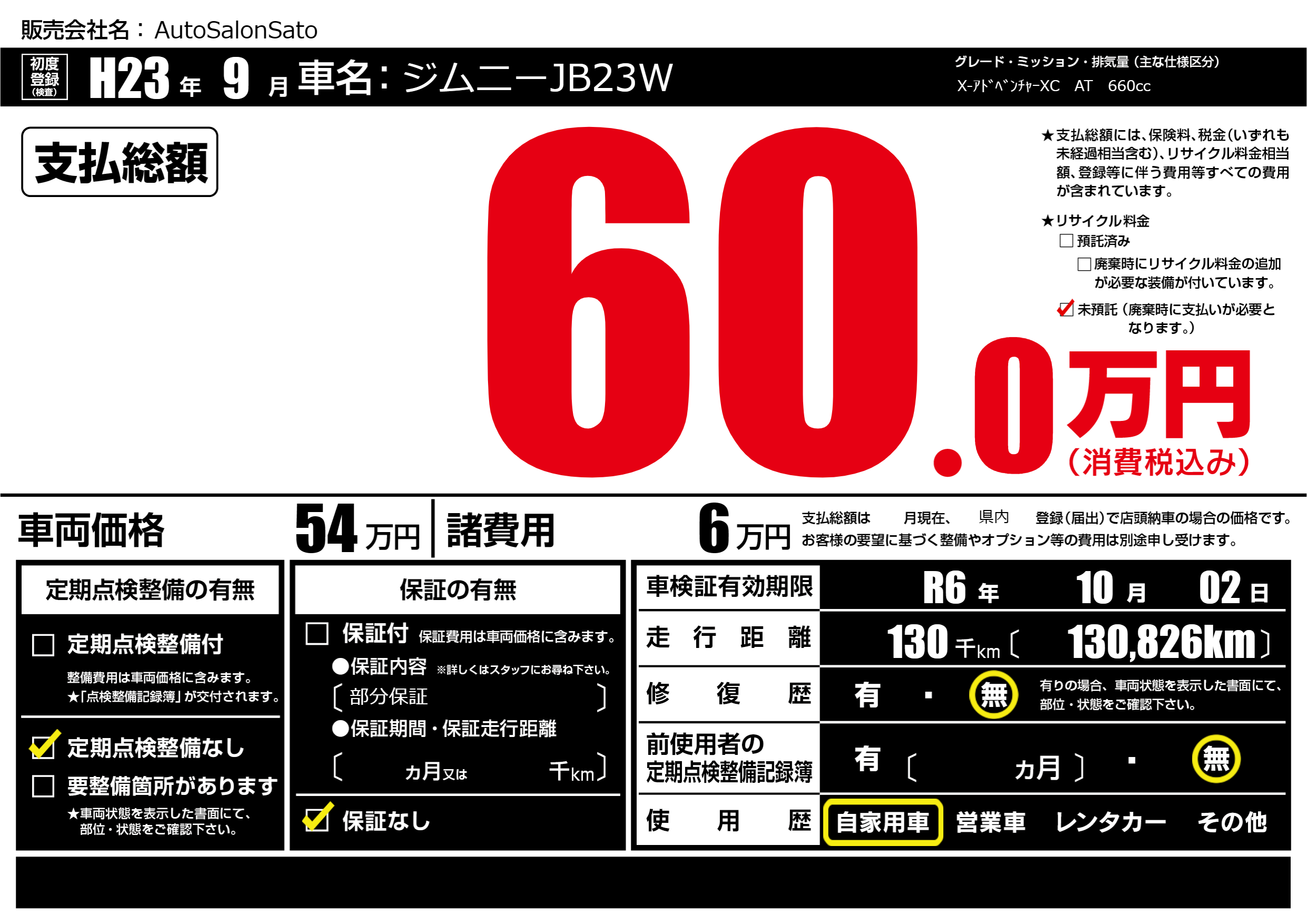 | 車検制限 | R6年 10月 02日 | ||