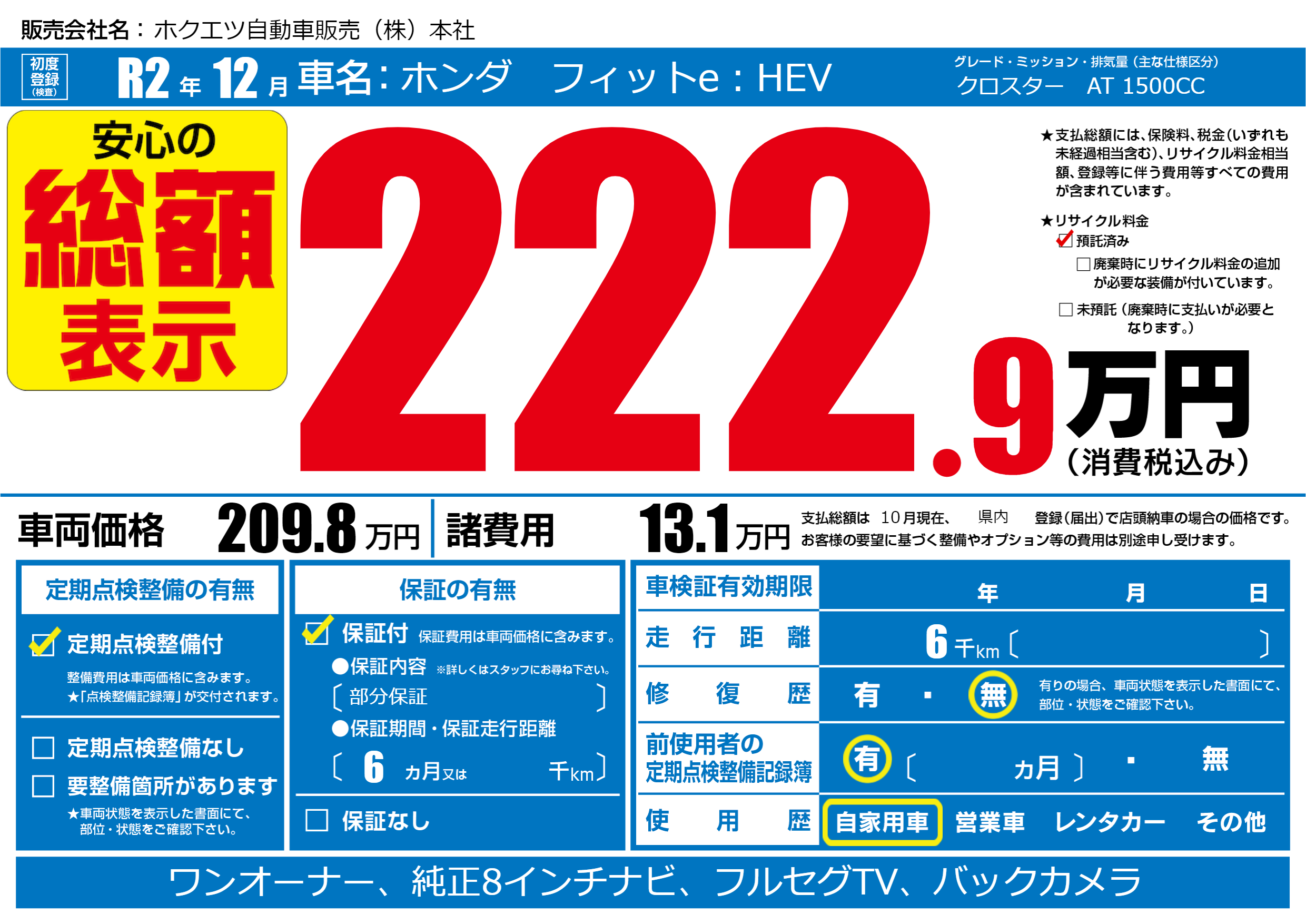 | 走行キロ | 0.6万km | 初年度登録 | R2年12月 |