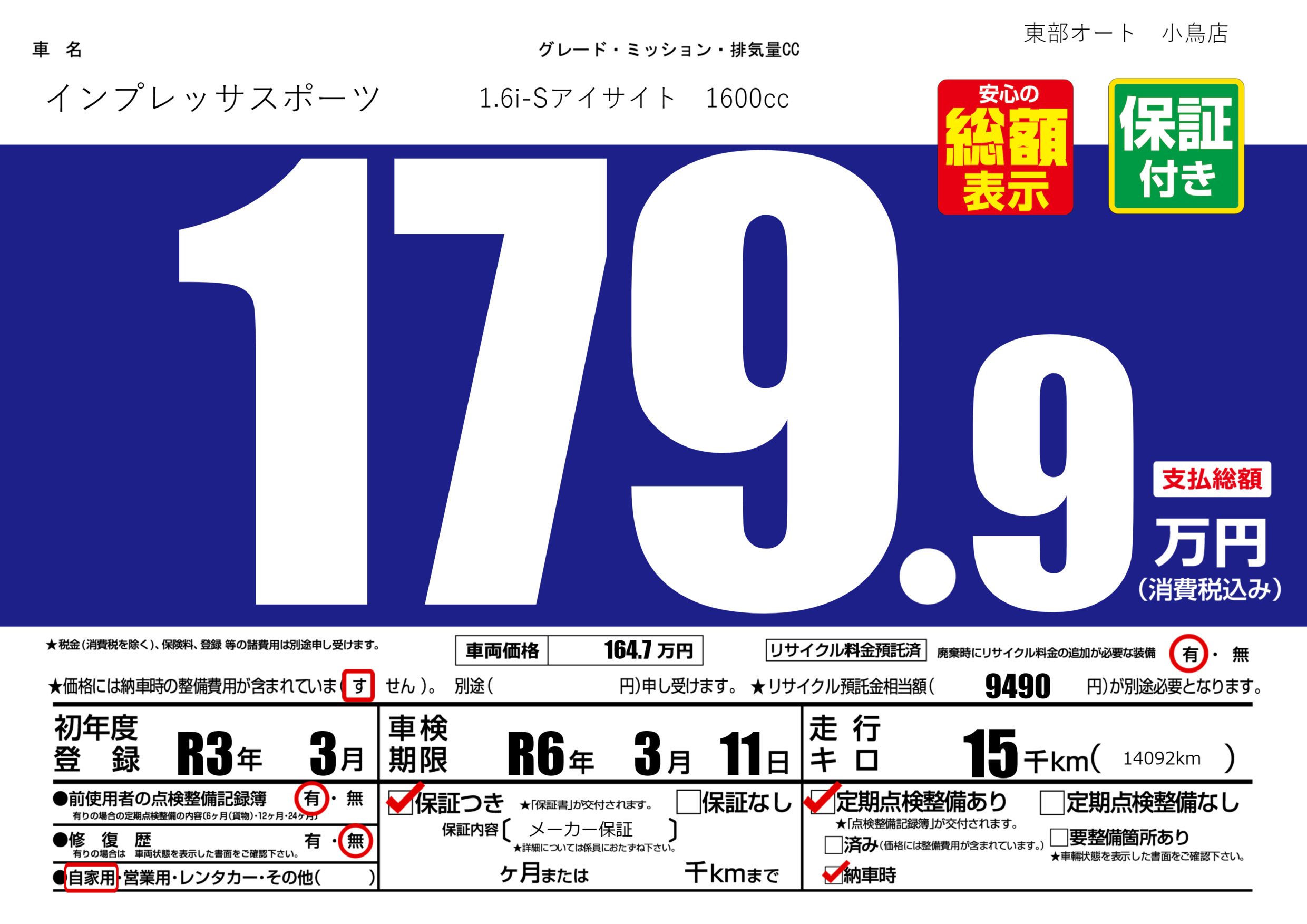 保証付き 保証内容( メーカー保証) ---ヶ月または()千kmまで |