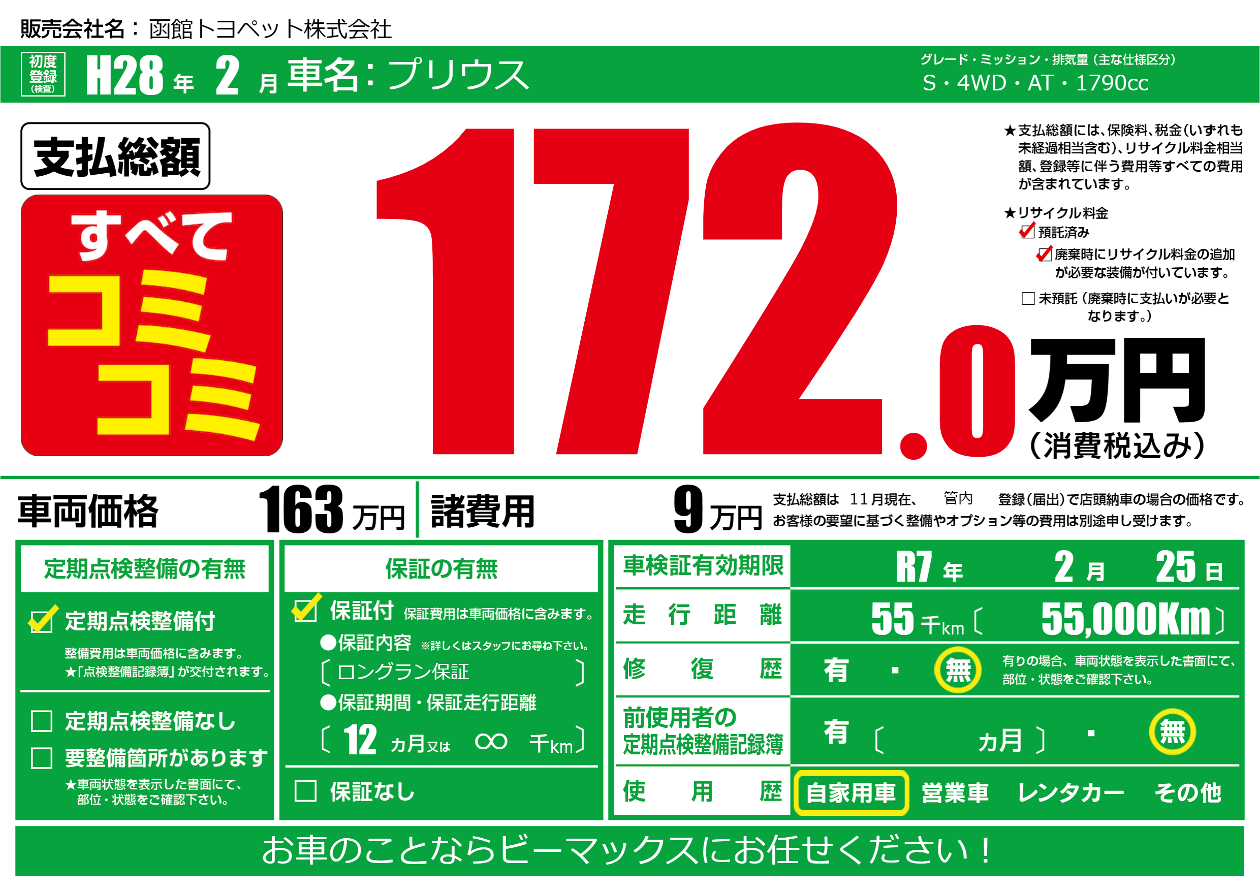 | 車名 | プリウス | グレード ミッション 排気量 |