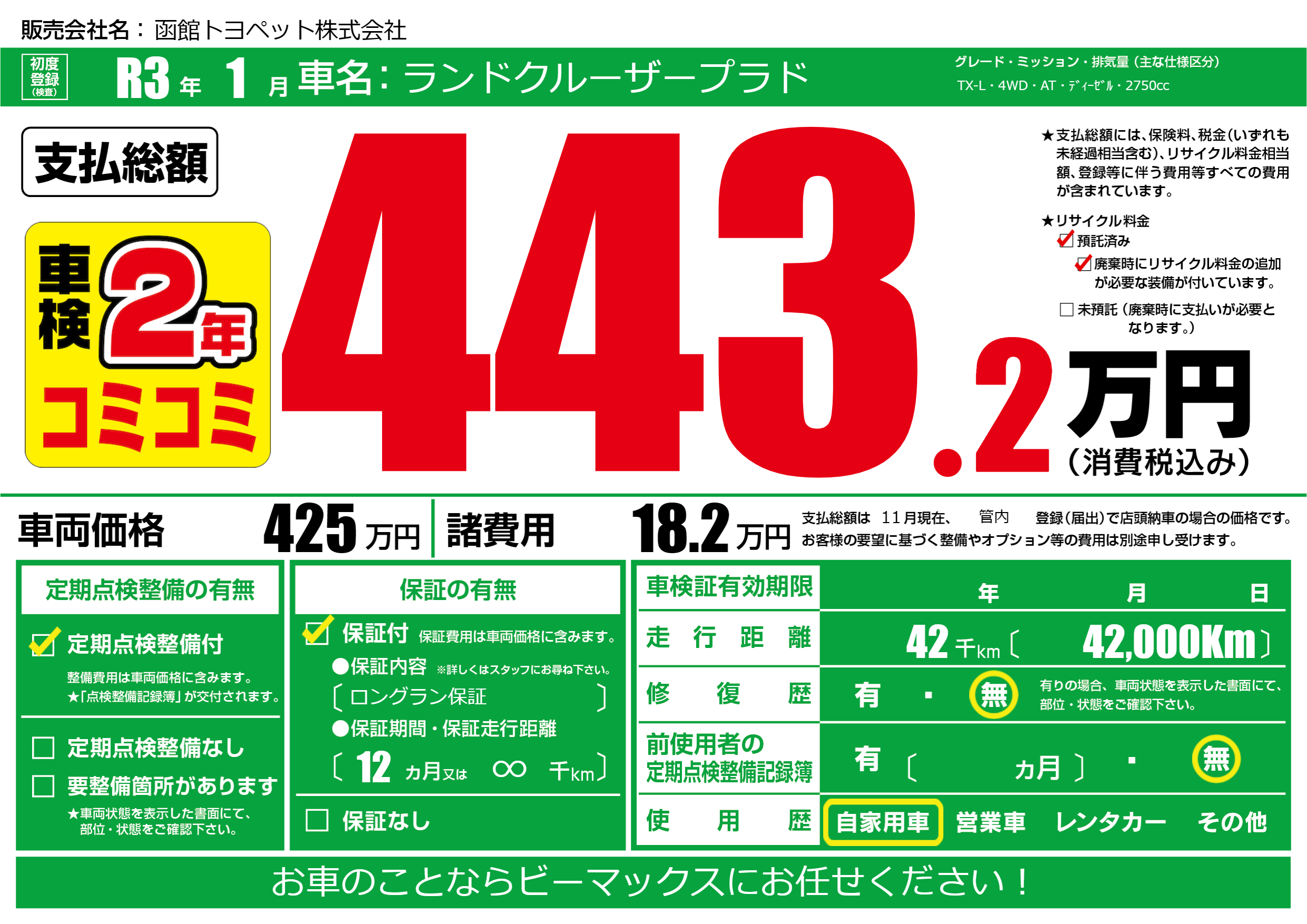 | 車名 | ランドクルーザープラド | グレード ミッション 排気量 |